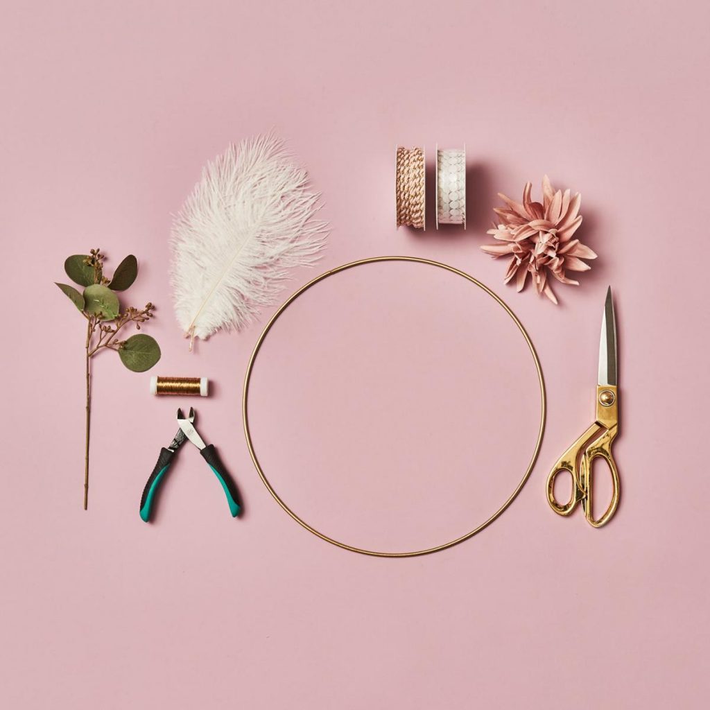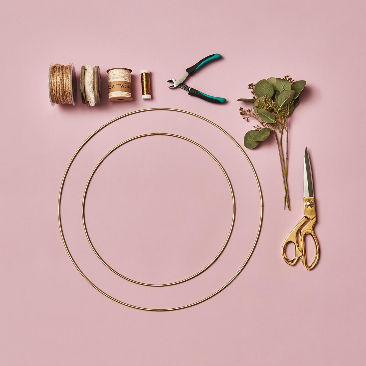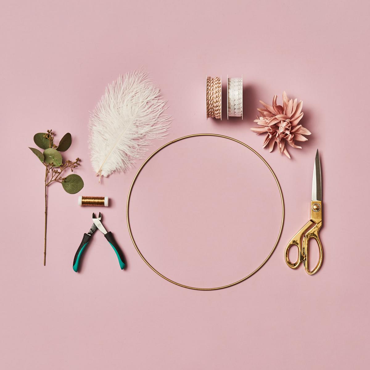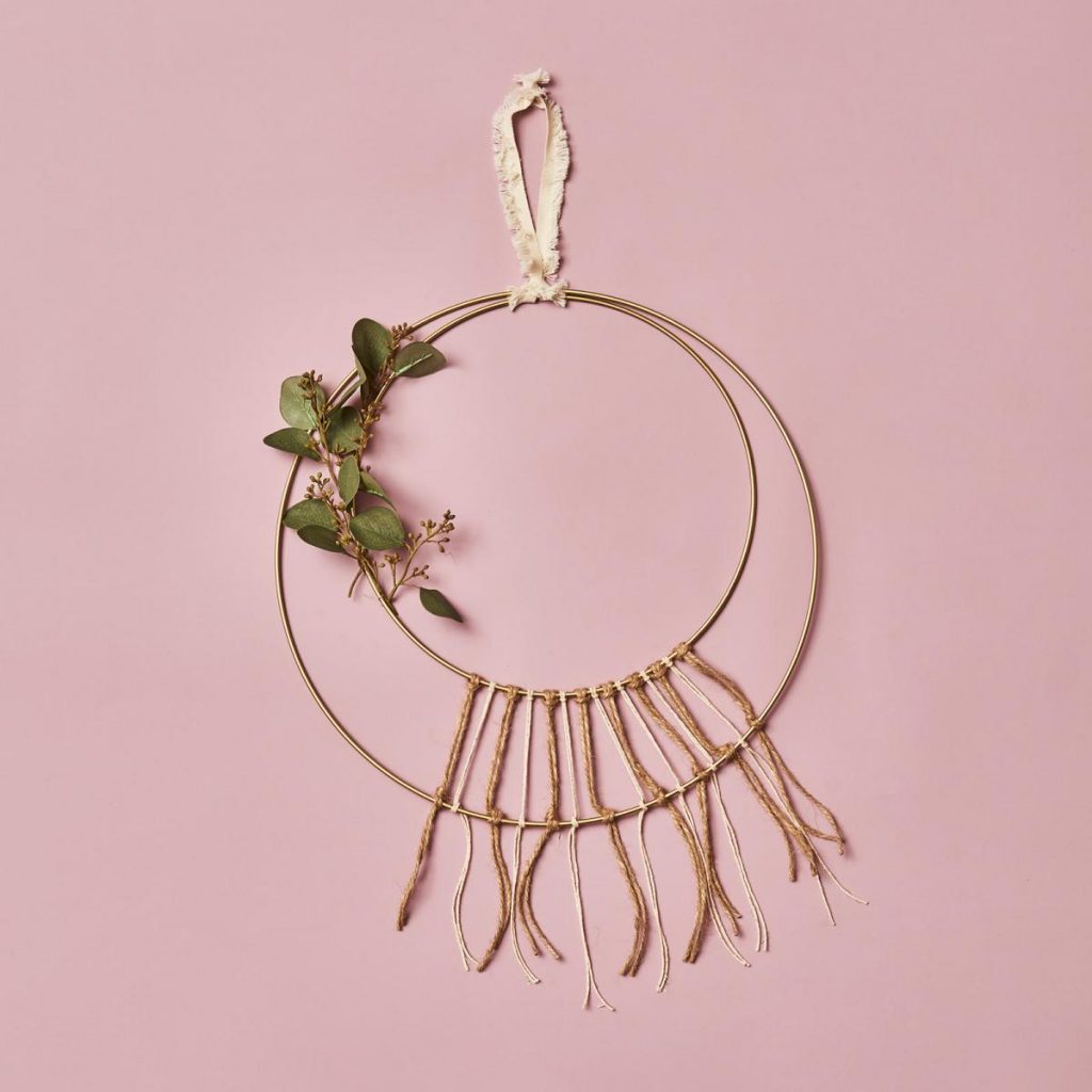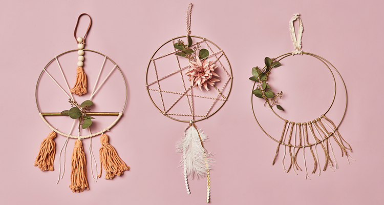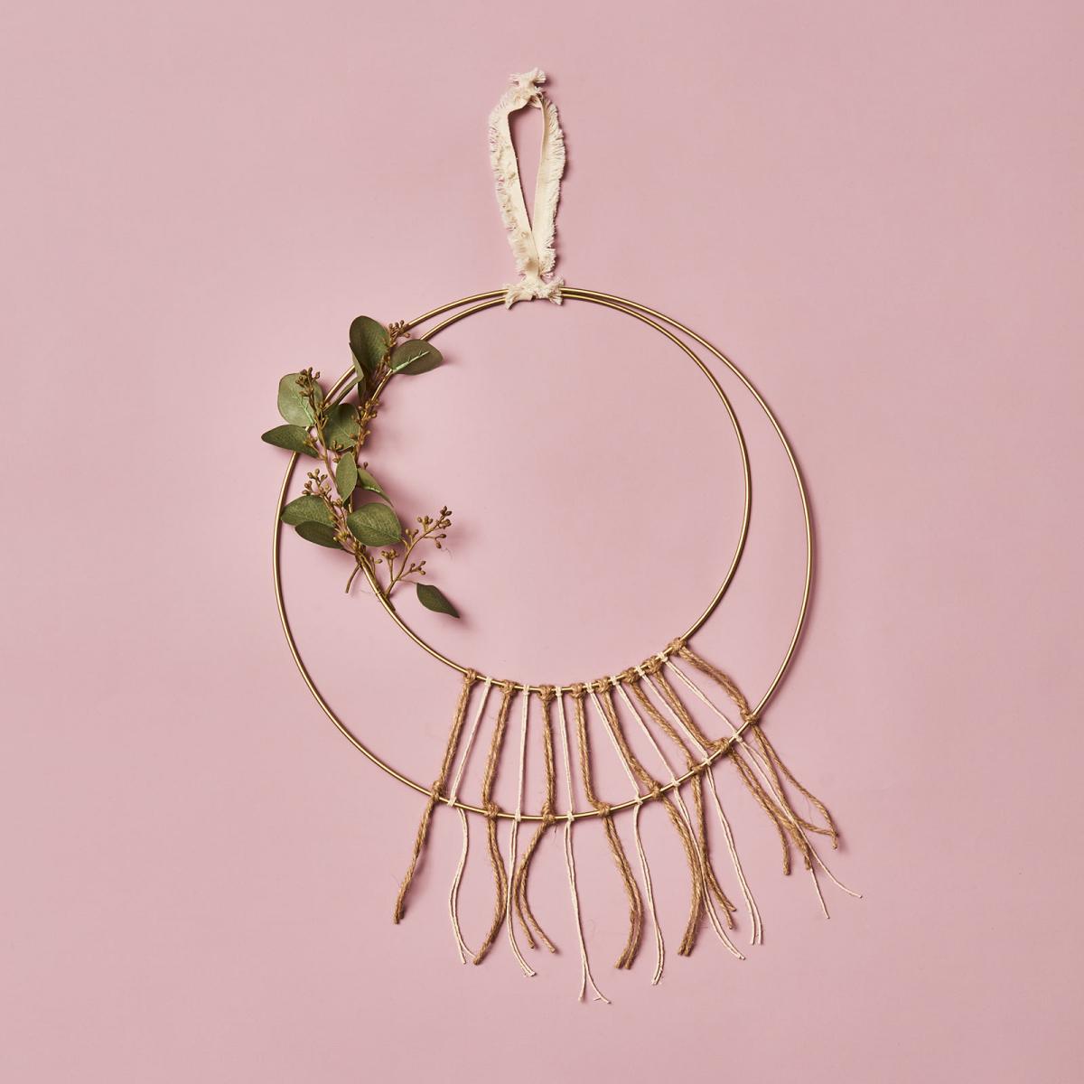 - Da unser Dekoanhänger bereits tolle pfirsichfarbenden Quasten besitzt, lässt sich damit super schnell ein Traumfänger selber machen. Schneide im erstem Schritt den Eukalyptusstiel ab und binde die Blätter mit Draht an der goldenen Mittelstange des Traumfängers fest.