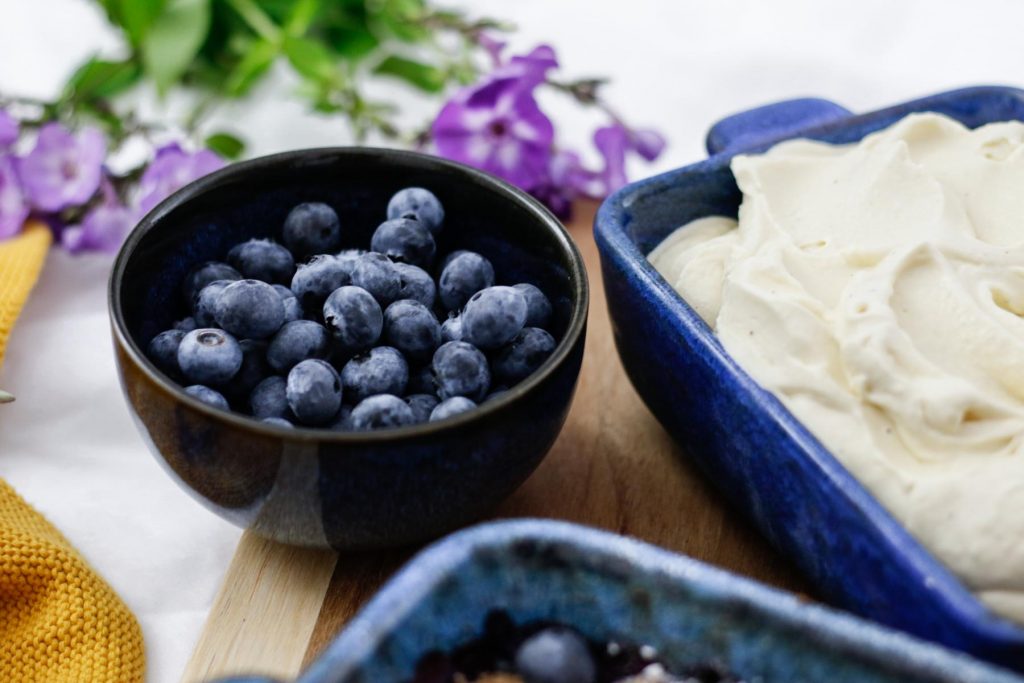 Kaum etwas entspannt mich so sehr wie das Backen, der Duft, der aus dem Backofen strömt und natürlich das anschließende Genießen. Ich habe ja schon Wasserhochstand im Mund, wenn ich an die blubbernden Heidelbeeren denke, nachdem sie eine knappe halbe Stunde unter buttrigen Haferflocken-Zimt-Streuseln in der Hitze des Backofens hinter sich haben und sich das himmlische Ricotta-Eis bereits vorfreudig die (eiskalten) Händchen reibt.
