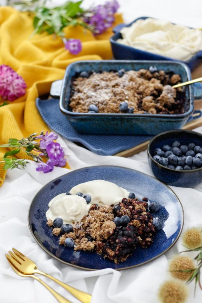 Crumbles sind etwas so seelenwärmendes und mit cremigen Eis und tiefblauen Heidelbeeren vom Markt kann der Herbst gerne kommen. Ich freue mich Jahr für Jahr auf diese goldene und kuschlige Saison. Wir sind auch bereit für kuschelige Abende zuhause, heiße Tassen Tee und leckere Auflauf Ideen!