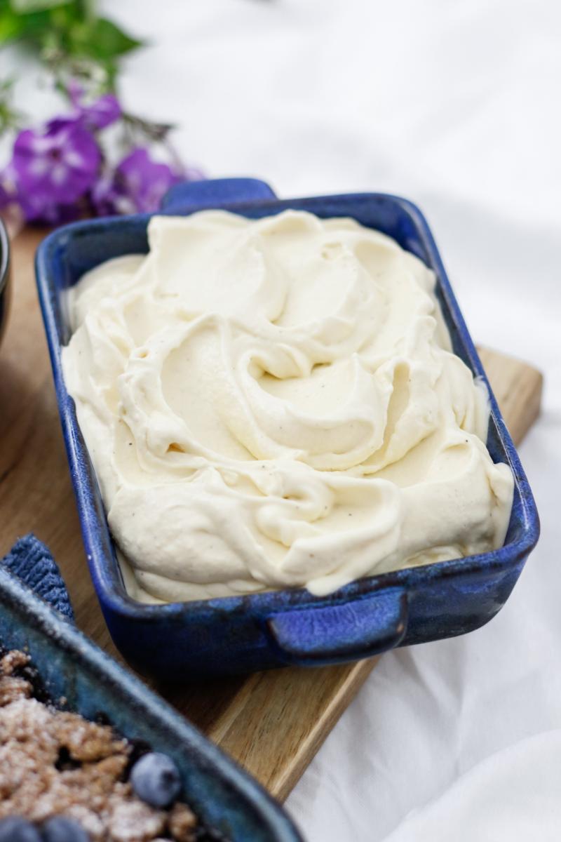 - Die Masse in die Eismaschine füllen und 20-25 Minuten cremig gefrieren lassen. In eine gekühlte Form geben und nochmal für mind. 1-2 Stunden tiefkühlen. Dann ist es perfekt zum Servieren.
