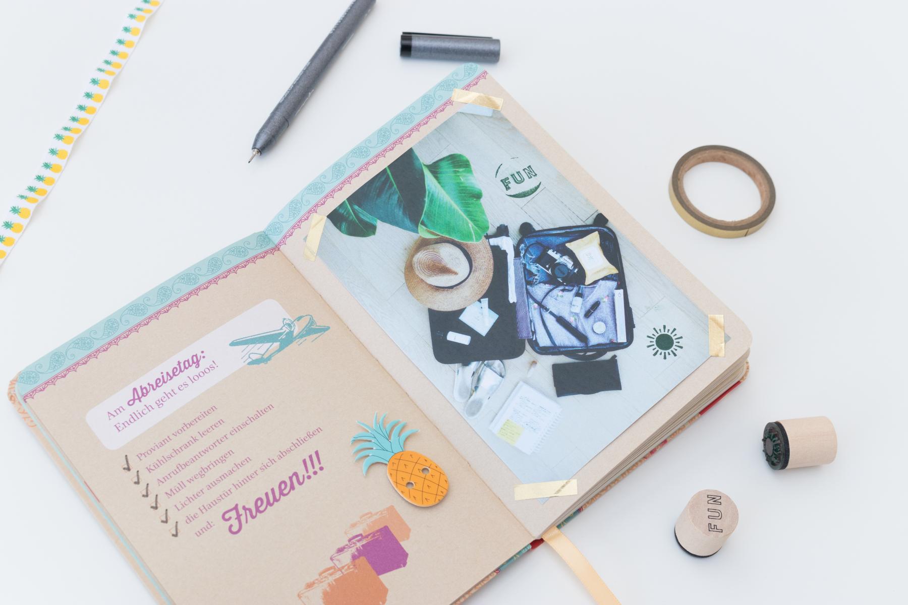 Vor der Reise ist es immer praktisch, eine Checkliste zu schreiben, um die wichtigsten Dinge abzuhaken und den Überblick zu behalten. Da bietet das Reisetagebuch von GROH schon eine vorgeschriebene Liste, die du mit Haken versehen kannst, wenn du eine Sache erledigt hast. Auf der anderen Seite habe ich noch ein Bild mit einem farbigen Klebeband eingeklebt, um mir einen Überblick über meinen Koffer zu verschaffen.
