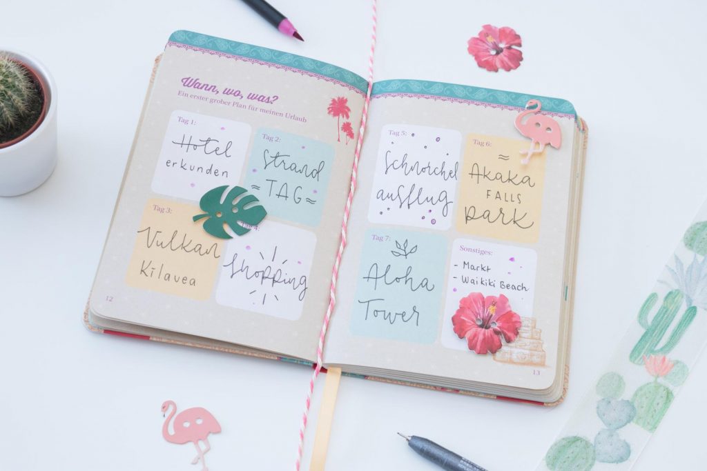 Ich informiere mich gerne vor einer Reise im Internet, welche Aktivitäten ein Ort bietet. Dafür habe ich die vorgefertigten Kästchen genutzt, Tag für Tag geplant und mit Wörtern im Hand Lettering-Stil gefüllt. Kleine Elemente im Flamingo Style lassen die Seite noch schöner wirken und bringen ein wenig Farbe ins Spiel. Das vorhandene Lesebändchen kann super praktisch sein, um zu wissen, welche Seite du gerade beschrieben hast.