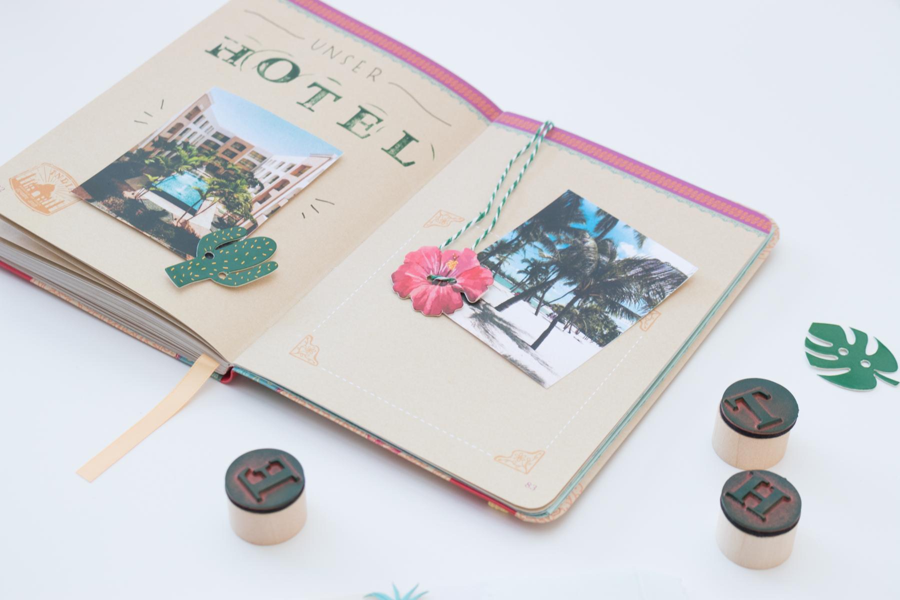 Mit dem Stempelalphabet kannst du die freien Seiten mit tolle, personalisierten Überschriften für deine wichtigsten Bilder gestalten. Ich habe die Stempelbuchstaben noch mit einer handgeschriebenen Schrift kombiniert und ein Erinnerungsbild darunter geklebt. Hier kannst du zum Beispiel auch die Koordinaten deines Hotels oder die tollsten Erlebnisse vor Ort notieren. Mit einem Garn und einem kleinen Element kannst du dir einen süßen Anhänger gestalten, der über deinen Bildern hängen kann.