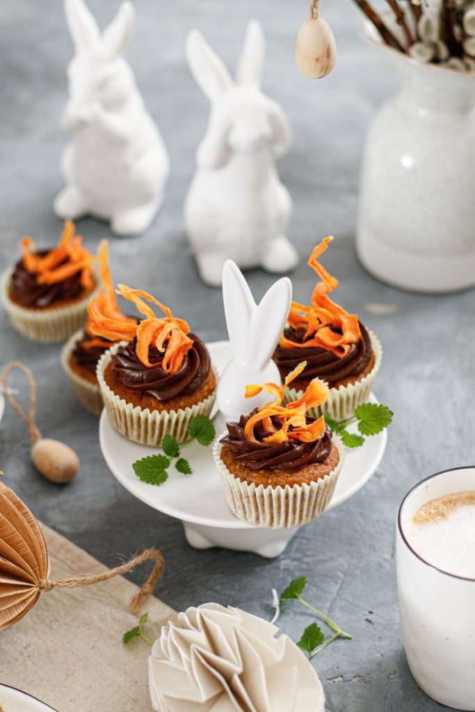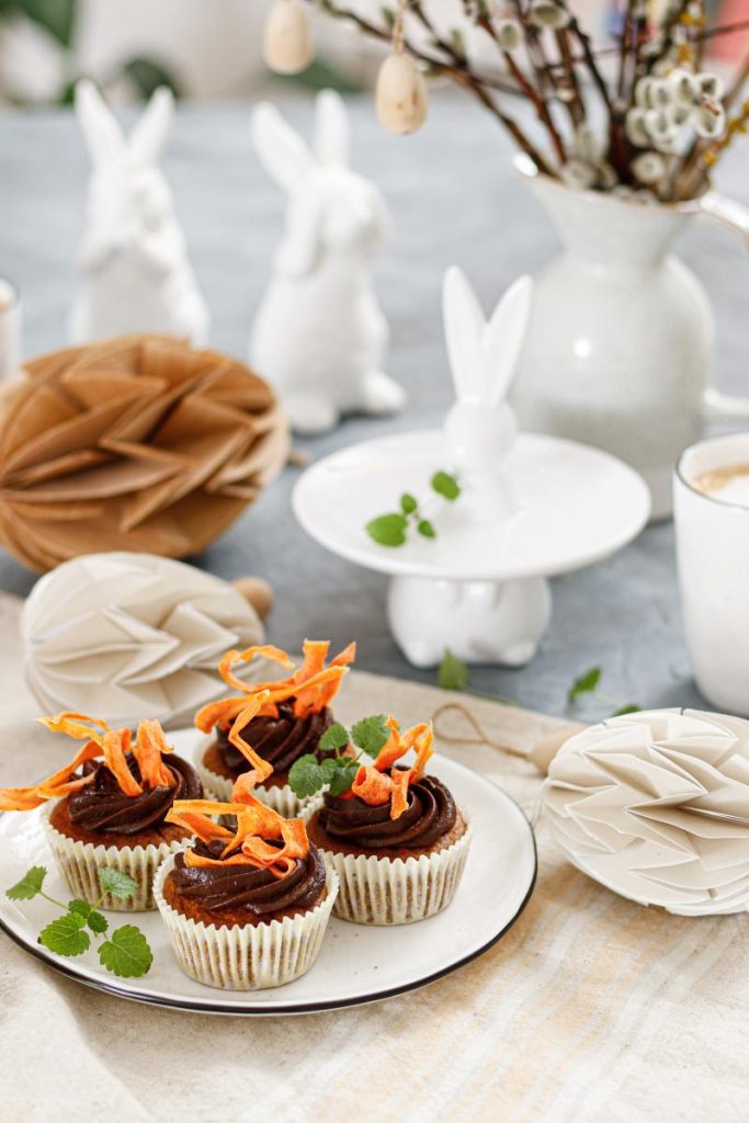 Die fertigen Küchlein können dann auf die schlichten Teller oder die niedlichen Etageren gesetzt werden. Ein paar süße Dekohasen bewachen unsere Leckereien und bringen zusätzlich noch bisschen mehr Osterstimmung auf den gedeckten Tisch.