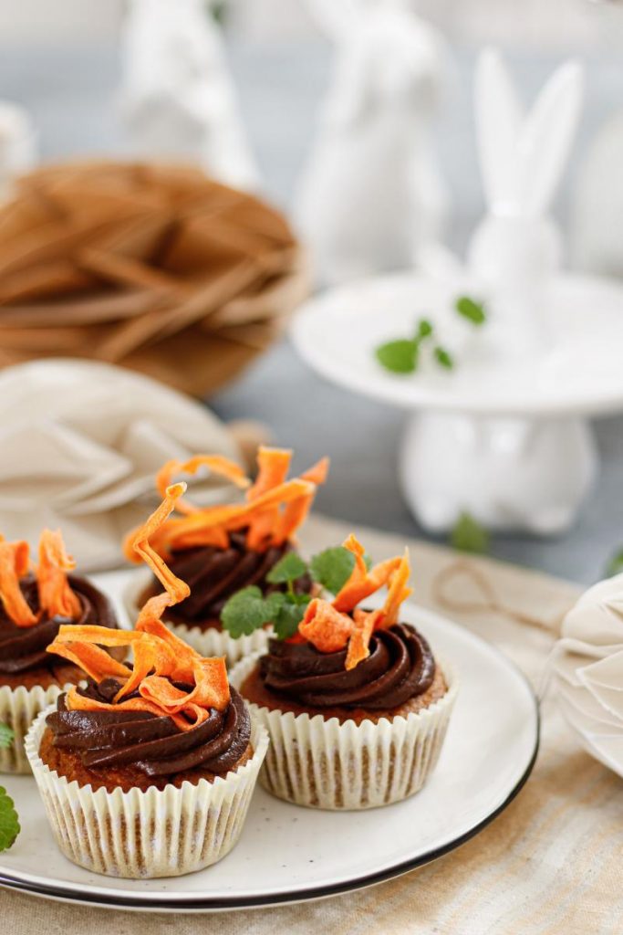 - Für die Creme alle Zutaten fein pürieren und 30 Minuten kühl stellen. Die Creme in einen Spritzbeutel mit Sterntülle füllen und auf die Küchlein dressieren. Mit den Karottenchips garnieren.