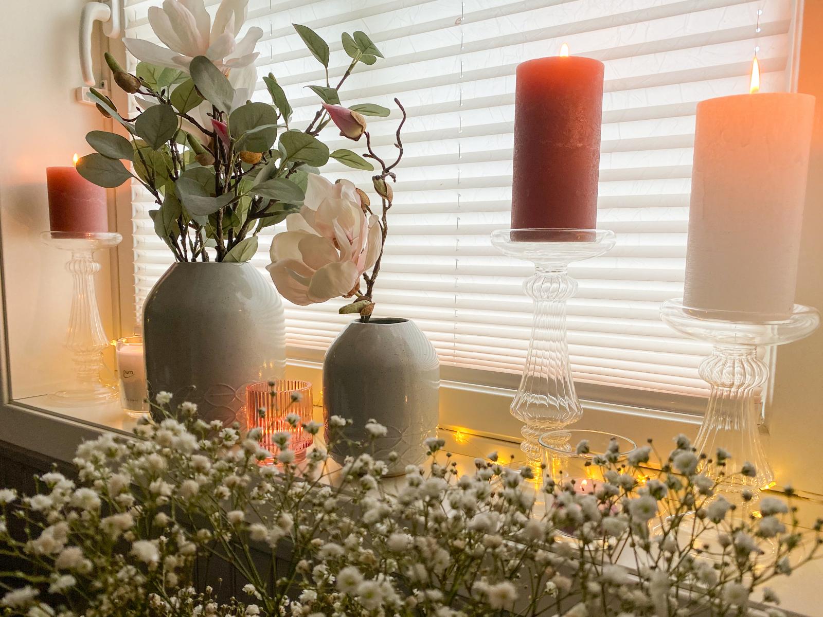 Als I-Tüpfelchen und als Vorbote des Frühlings habe ich noch ein paar Blumen in farblich passende Vasen gestellt und das Ganze mit Duftkerzen abgerundet. Auch mein neuer Raumduft verwandelt das Badezimmer in eine duftende Wohlfühloase.