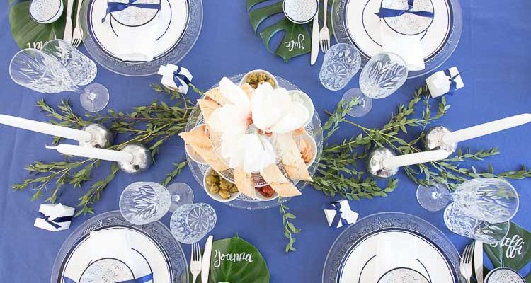 Unser roter bzw. blauer Faden bei dieser Tischdeko ist die Kombination von dunklem Blau mit Grün – umgesetzt und durchgezogen in Tischwäsche, Platzgestaltung und Deko aus Blättern. Und hier unsere 5 Tipps dazu: