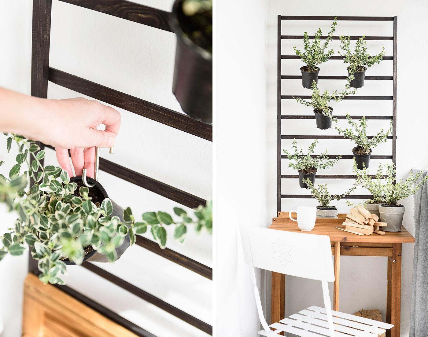 - Die Rankhilfe (oder das Spalier) wird einfach aufgestellt und an die Wand gelehnt, die Nagelstellen zeigen zur Wandseite. Hier steht sie hinter dem Pflanztisch für den Balkon von DEPOT. Damit das Spalier nicht wegkippt, kann es sicherheitshalber an die Wand geschraubt werden. In Pflanztöpfe könnt ihr mit einer Lochzange ein Loch stanzen und sie mit Metallhaken ans Spalier hängen. Auch Kräuter oder blühende Pflanzen können dort einen Platz finden. Ich habe meine Kriechspindel für eine grüne Wandbepflanzung aufgehängt.