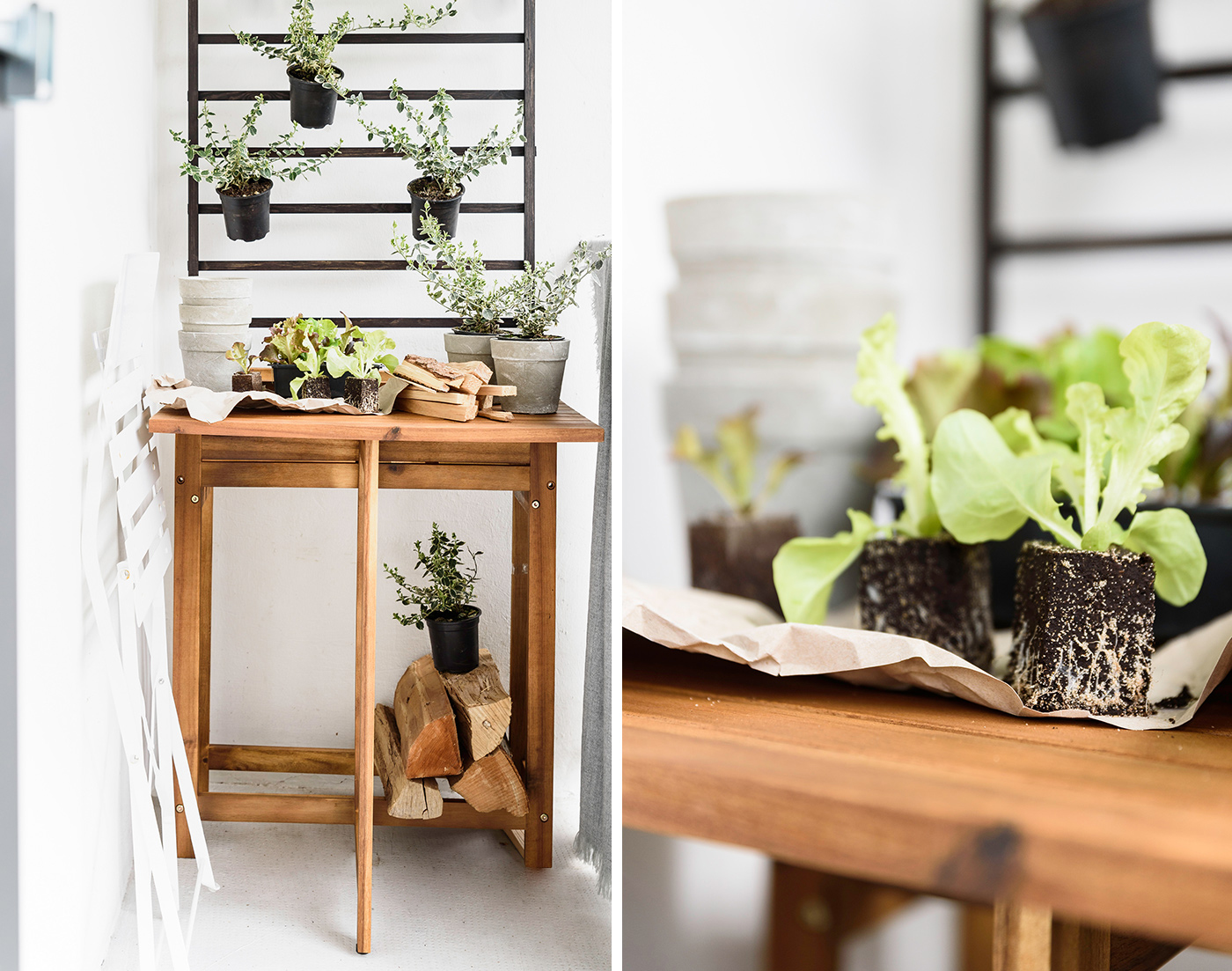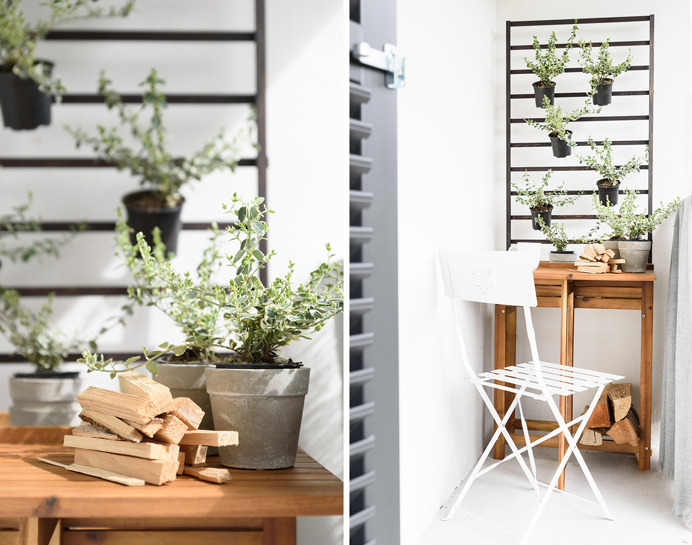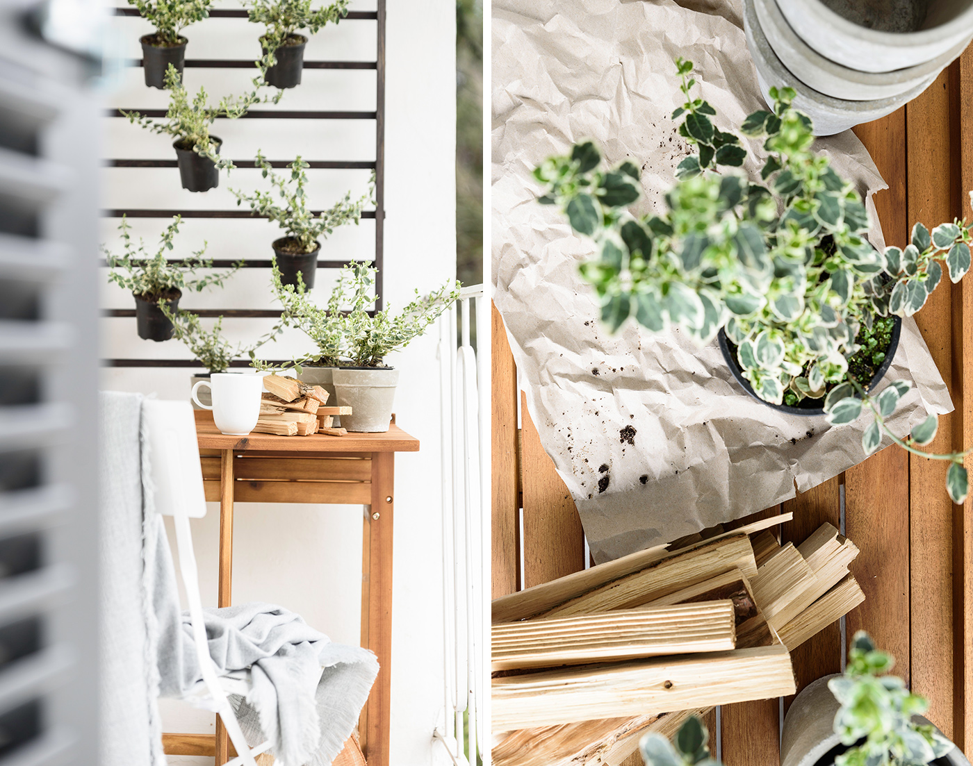 Tipp: Für alle, die einen kleinen Balkon besitzen, können zum Bepflanzen die vertikalen Bereiche des Balkons genutzt werden. Der Pflanztisch von DEPOT lässt sich platzsparend ausklappen. So entsteht außerdem ein schöner Sitzbereich. Die Wolldecke und die Pflanztöpfe sind ebenfalls von DEPOT!