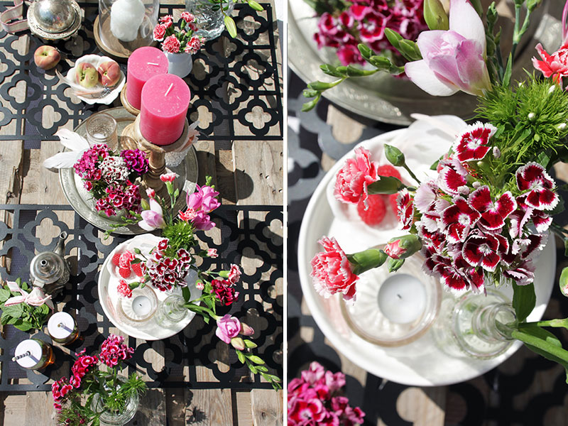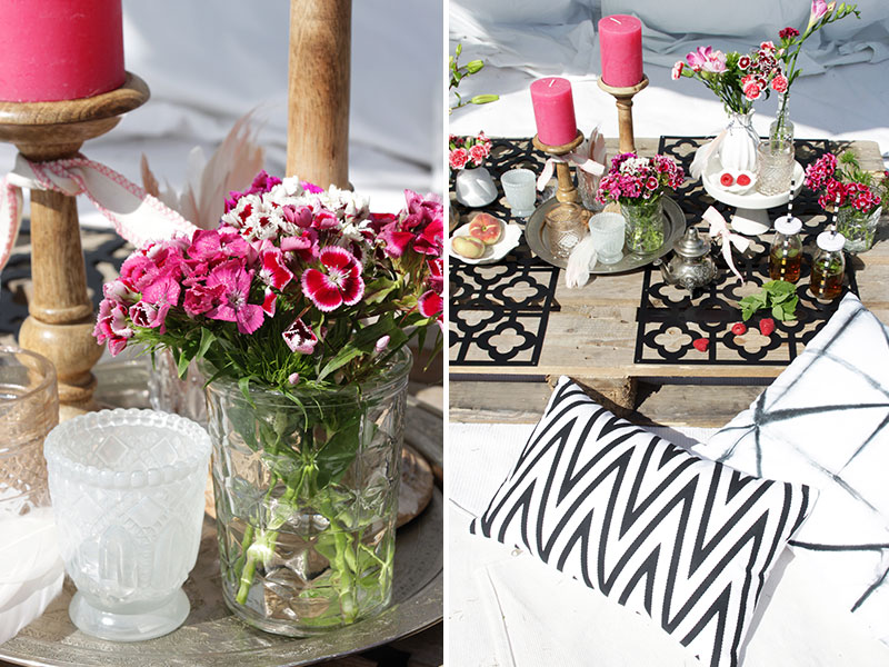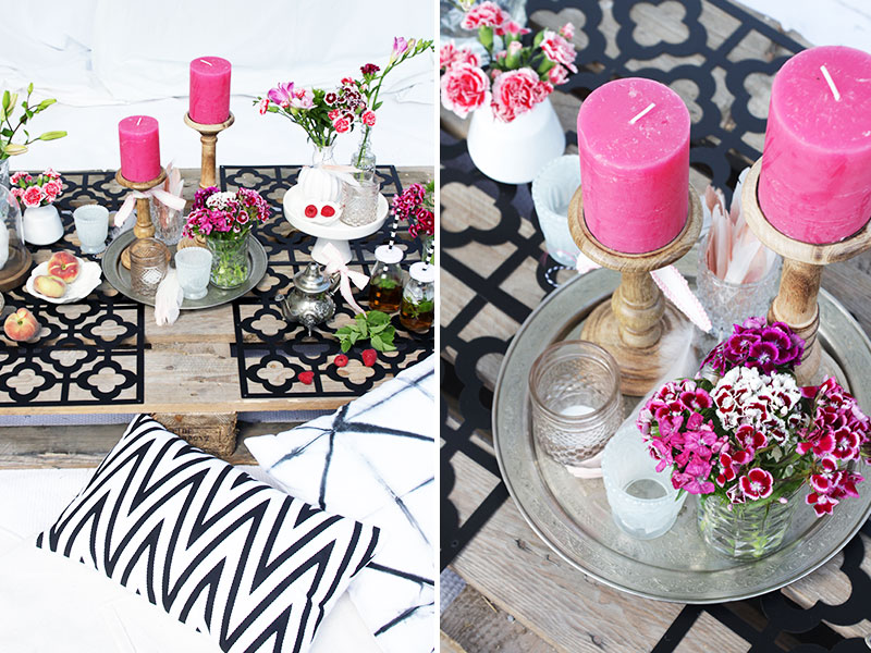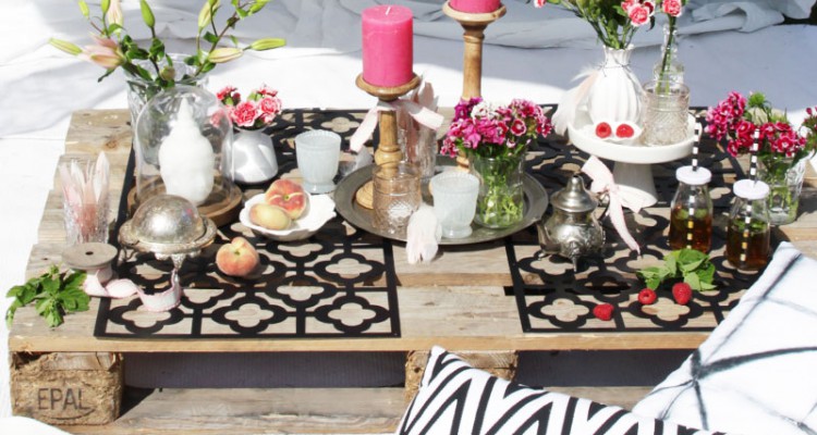 Damit der Look gelingt, braucht man nur 1-2 Paletten, viele Kissen und natürlich jede Menge Kerzen, Teelichter und schöne bunter Blumen. Als Untersetzer auf den Paletten habe ich einfach Deko-Panele zweckentfremdet. Diese eigenen sich wirklich hervorragend als Untersetzer und zum orientalischen Stil passen sie perfekt. Als Center-Piece verschieden hohe Kerzen und Teelichter zusammen mit kleinen Vasen auf einem Tablett arrangieren.
