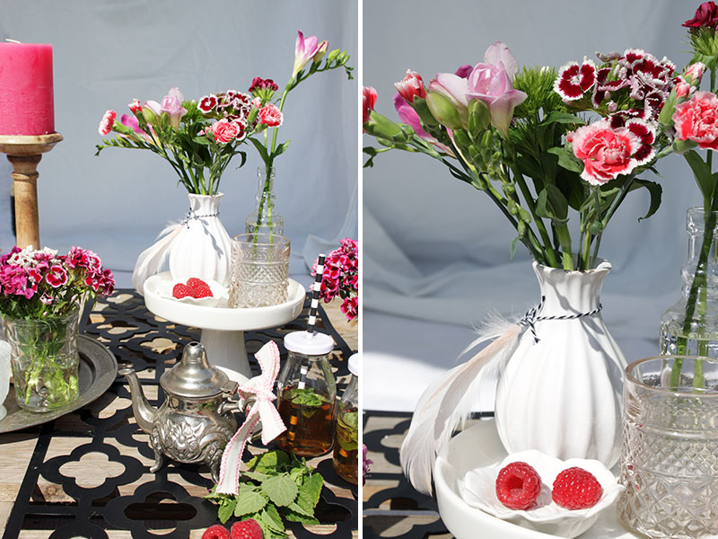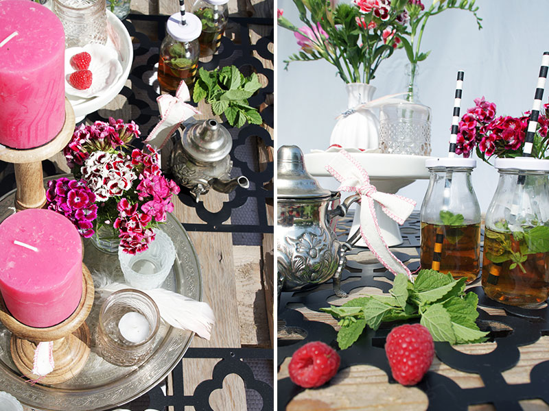 Den Gästen als Begrüßung einen Tee mit frischer Minze in kleinen Milchflaschen mit Deckel servieren und es ist schon fast wie im Urlaub.Dazu eventuell noch orientalisches Fingerfood, wie Datteln im Speckmantel oder kleine Teigtaschen reichen. Da kann die Gartenpartysaison ja beginnen. Viel Spaß beim Nachdekorieren und Feiern. Eure Mona