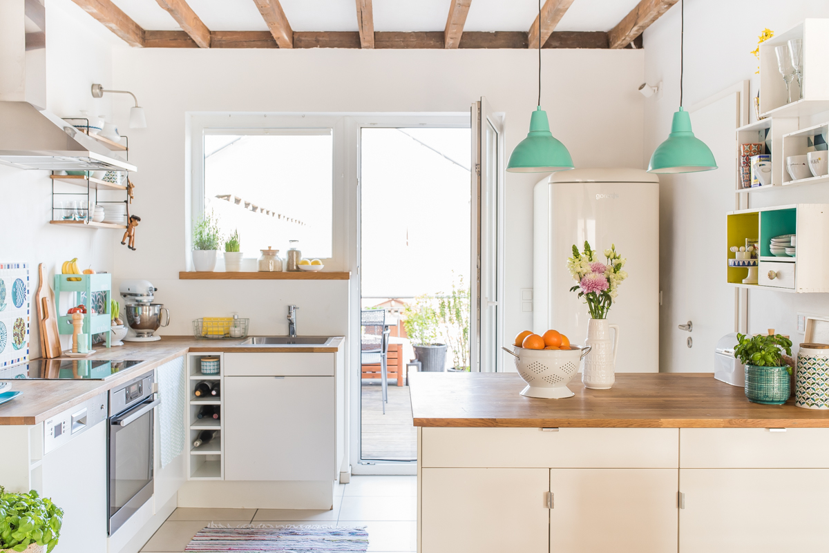 Unsere Küche ist offen und geht in den Wohnbereich über. Durch eine Speisekammer, die jede Menge Stauraum bietet, konnten wir auf Hängeschränke verzichten. Wir haben nur ein paar offene Regale aufgehängt, in denen ich gerne mein Lieblingsgeschirr ausstelle. Von der Küche aus kommt man auf unseren großen Balkon. Im Sommer ist die Tür eigentlich immer offen und Freunde benutzen nicht die Haustüre, sondern kommen immer direkt in unsere Küche.