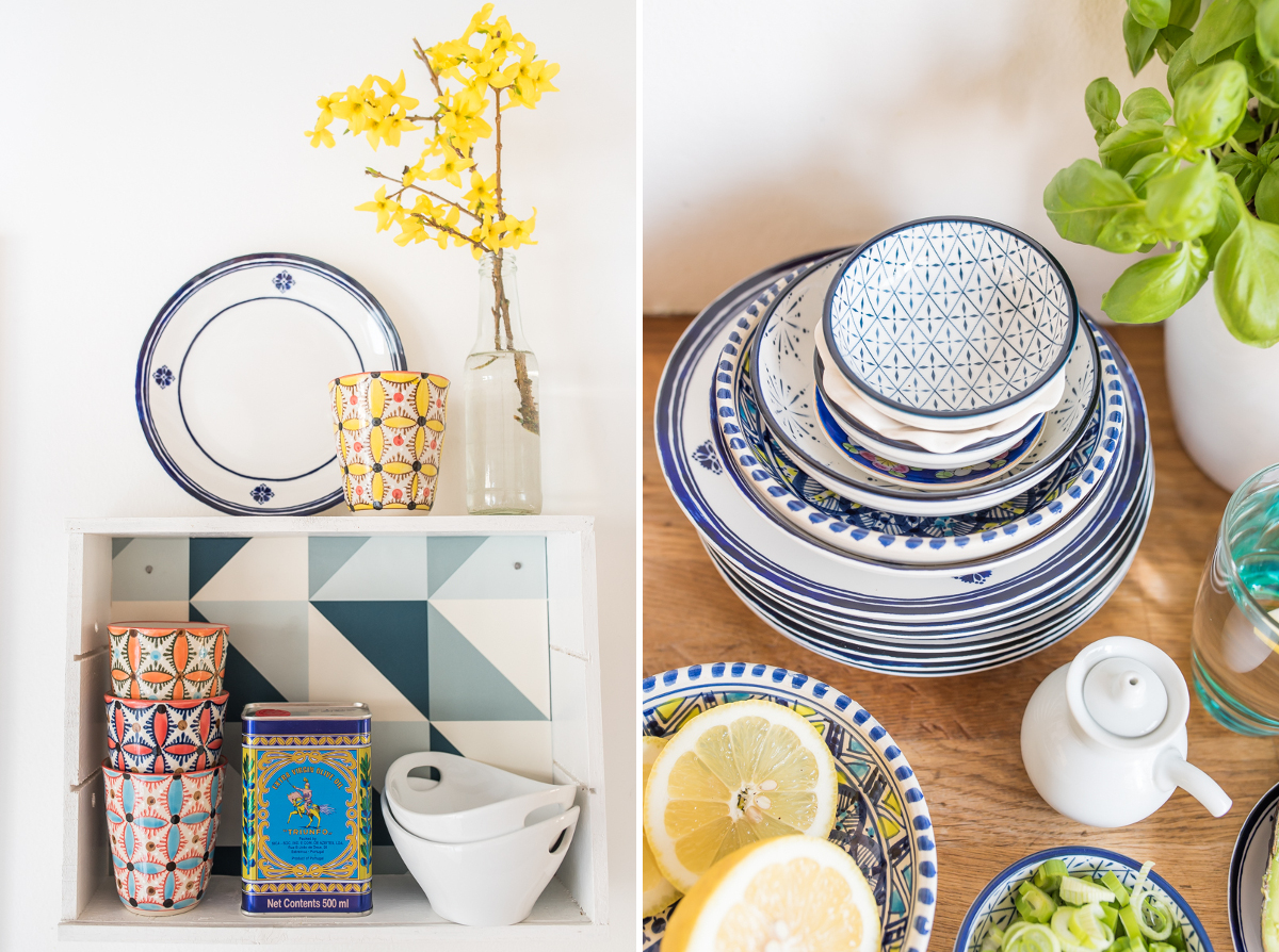 Mein Geschirr ist ein bunter Mix aus vintage Stücken und neuen Teilen. Die Teller aus der Pure Ornament Serie von DEPOT passen perfekt zu meinem Sommerlook, da sie mich an portugiesische Fliesen erinnern.