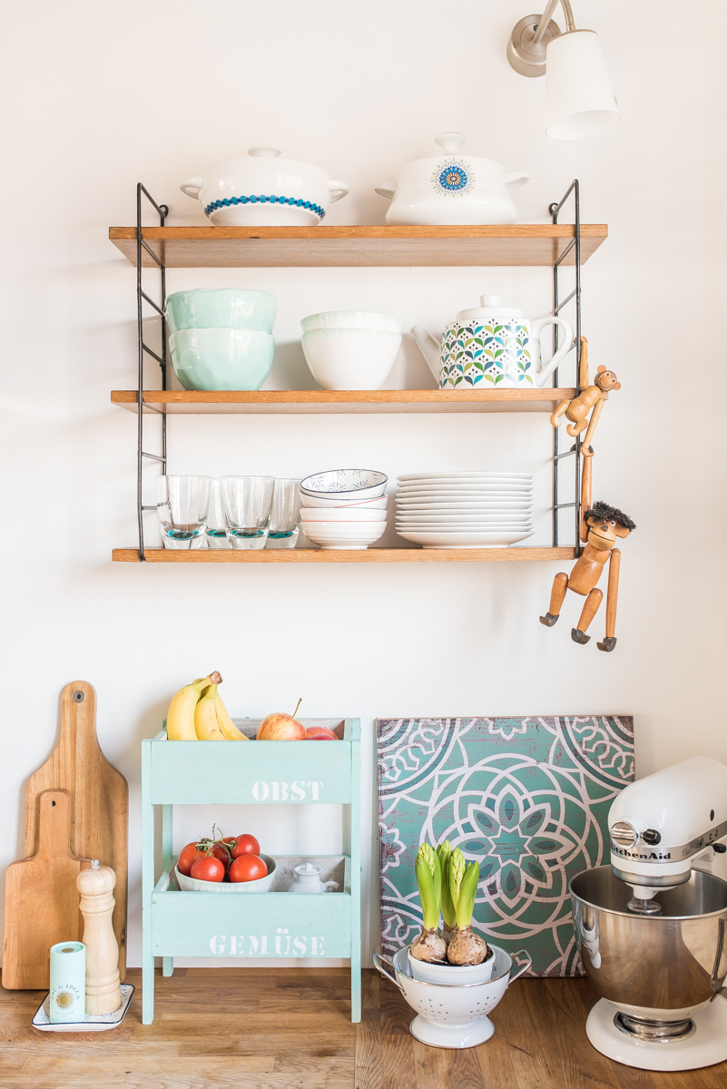 Auf der anderen Seite hängt ein String Regal aus den 60er Jahren, in dem unser Frühstücksgeschirr steht.