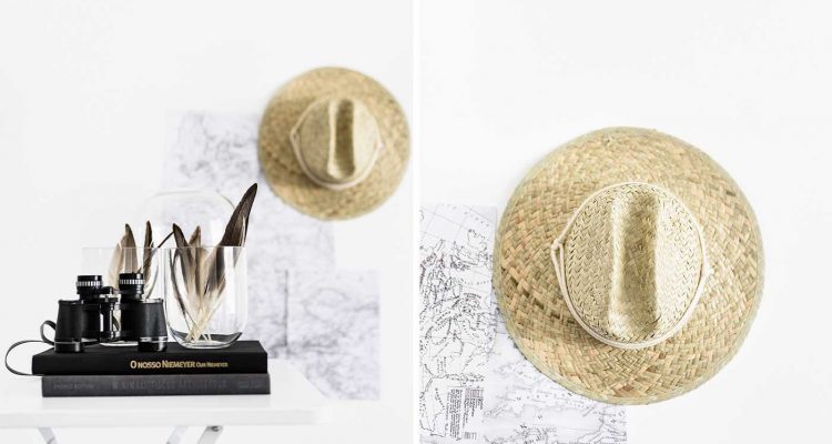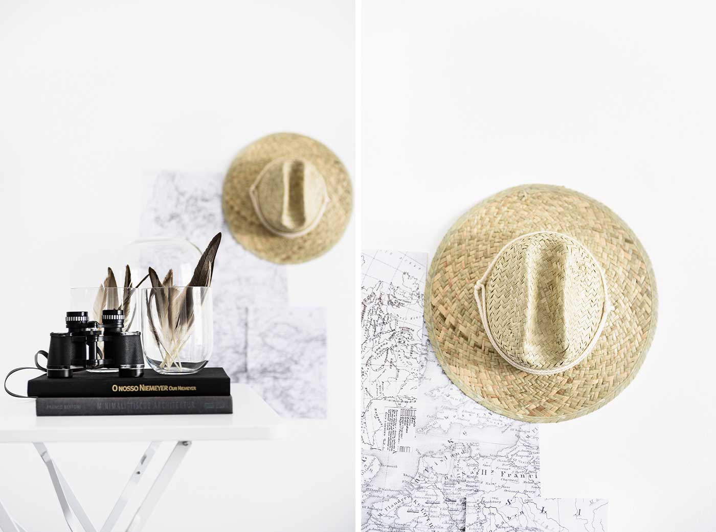 - Den Hintergrund des Stilllebens bilden Kartenabschnitte, die profan an die Wand geheftet wurden. Dazu gesellt sich der Strohhut, ein tolles Dekoelement. Die Karten könnt ihr kopieren oder ausdrucken. Meine sind monochrome gehalten, damit sich sich in das Gesamtkonzept einfügen.