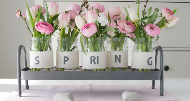 Ranunkeln, Tulpen und Pfirsichzweige in kleinen Gläsern arrangiert ist ein richtiger Hingucker auf dem Esstisch. Ich verwende dabei oft kleinere Einmachgläser und verziere sie mit schönen Bändern. Es braucht nicht viel und man hat eine hübsche Dekoration, aber man kann sie immer noch etwas aufwerten mit einfachen Tricks wie zum Beispiel mit dem Wort „Spring“.