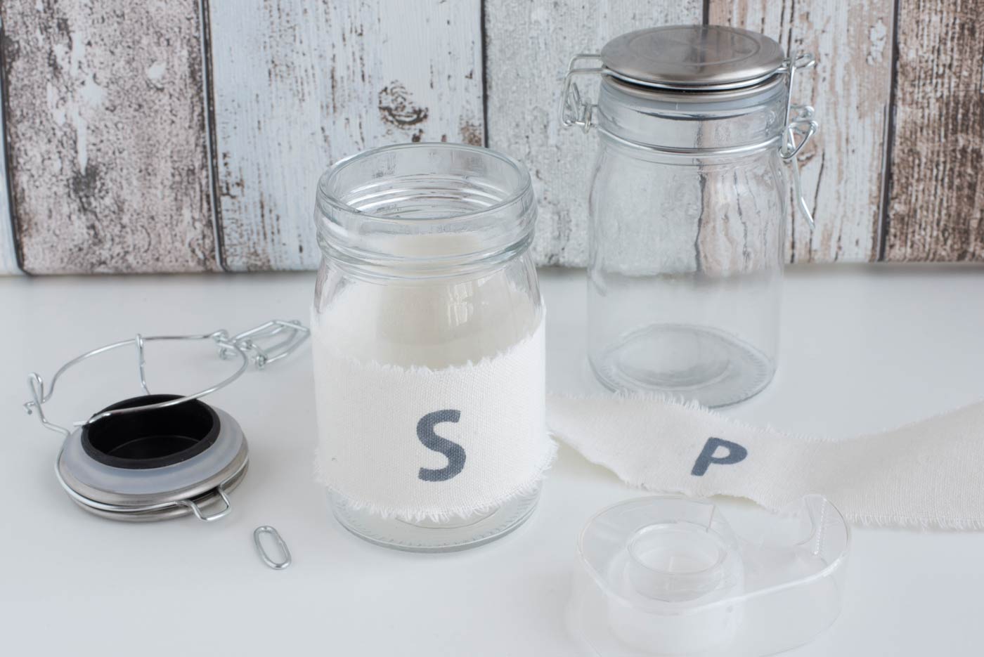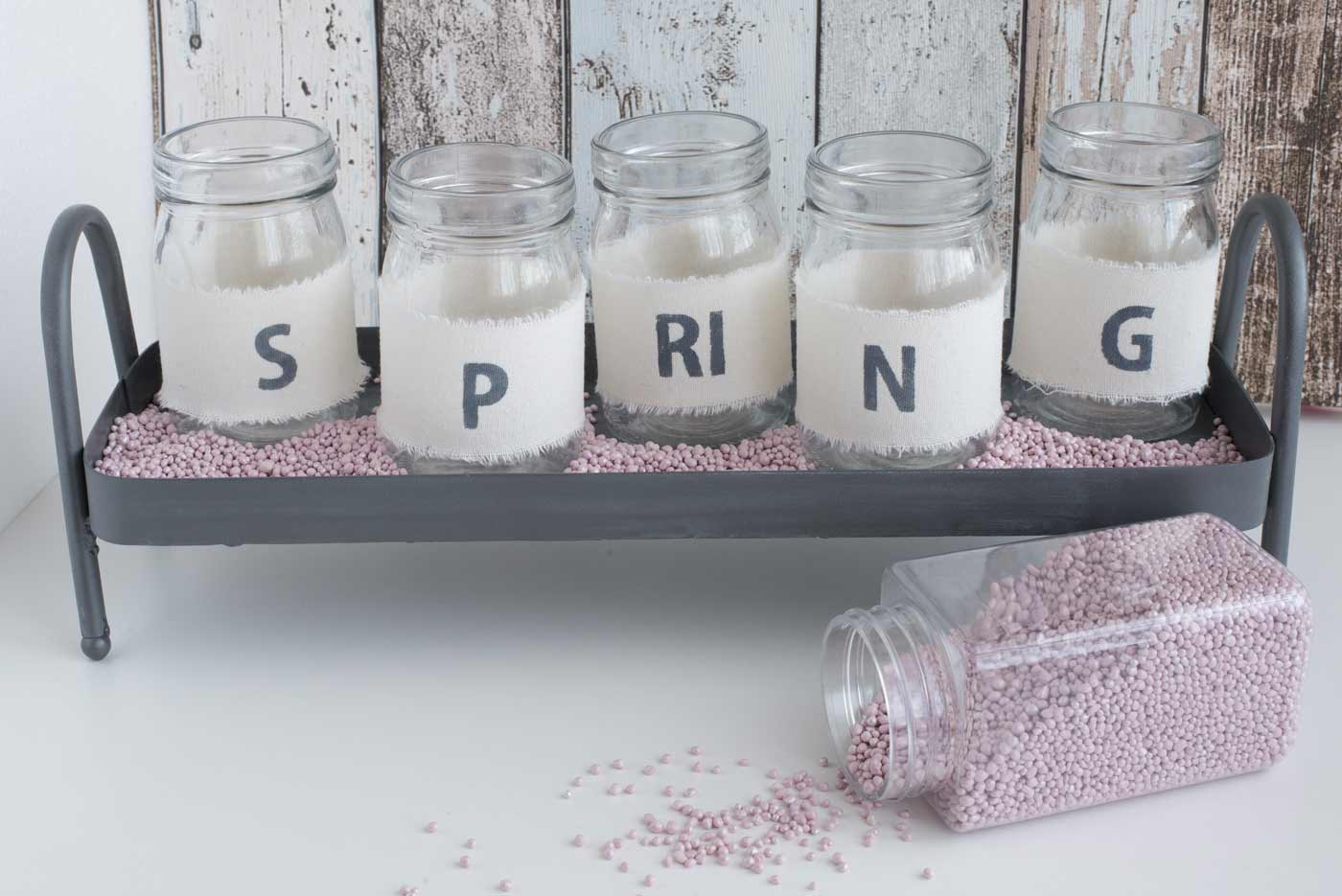 Das Leinenband auf die benötigte Länge (Umfang plus 1cm) der Vorratsgläser zuschneiden. Die Buchstabenschablone mittig positionieren, etwas Farbe auf den Schwamm nehmen und die entsprechenden Buchstaben betupfen. Wenn man keine Schablone zur Hand hat, kann man ganz einfach von Hand mit einem Bleistift die Buchstaben vorschreiben und mit einem Pinsel die Farbe auftragen. Eine Stunde trocknen lassen. Mit dem doppelseitigem Klebestreifen die Bandenden fixieren, dabei darauf achten, dass es ganz straff gezogen ist. DIY-Frühlingsdeko-2Deko-Granulat ins Deko-Tablett geben und die Gläser platzieren. Frisches Wasser in die Gläser füllen. Die verschieden Blumen auf unterschiedlichen Höhen kürzen und hübsch in den Gläsern arrangieren.