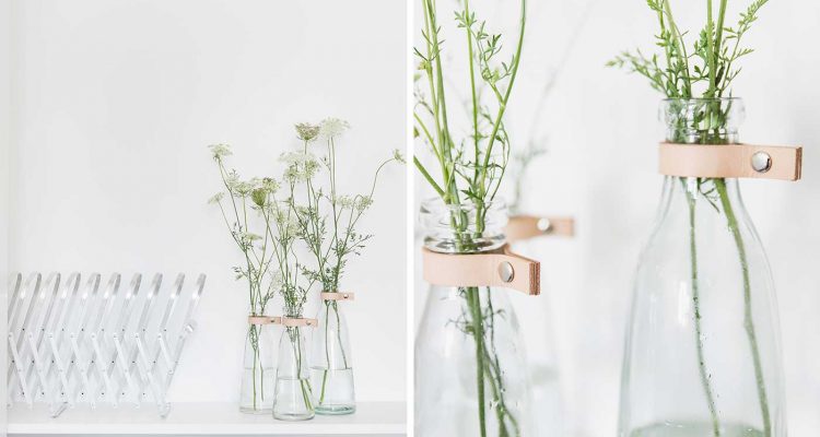 Die Flaschenvasen von DEPOT sind meine Lieblingsstücke. Solitärblumen lassen sich darin ganz toll arrangieren. Nun wollte ich die vielgenutzten Glasvasen einmal optisch verändern, das geht ganz einfach mit Lederriemen: