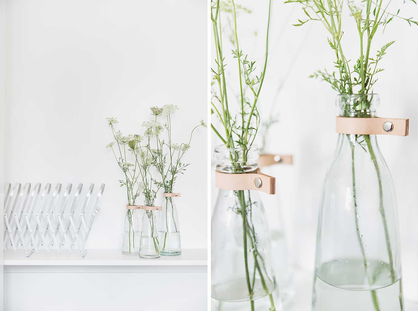 Die Flaschenvasen von DEPOT sind meine Lieblingsstücke. Solitärblumen lassen sich darin ganz toll arrangieren. Nun wollte ich die vielgenutzten Glasvasen einmal optisch verändern, das geht ganz einfach mit Lederriemen: