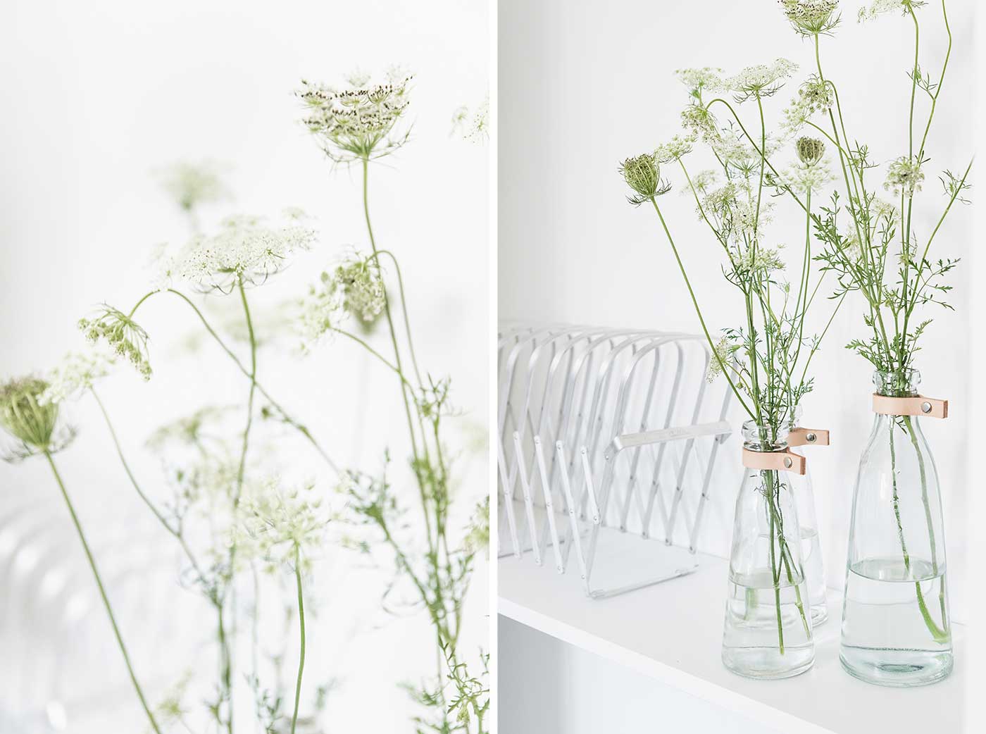 Deko: Selbst in de Stadt wachsen schöne Wildblumen. Die „Wilde Möhre“ macht sich als Einzelblume sehr gut in den Flaschenvasen.
