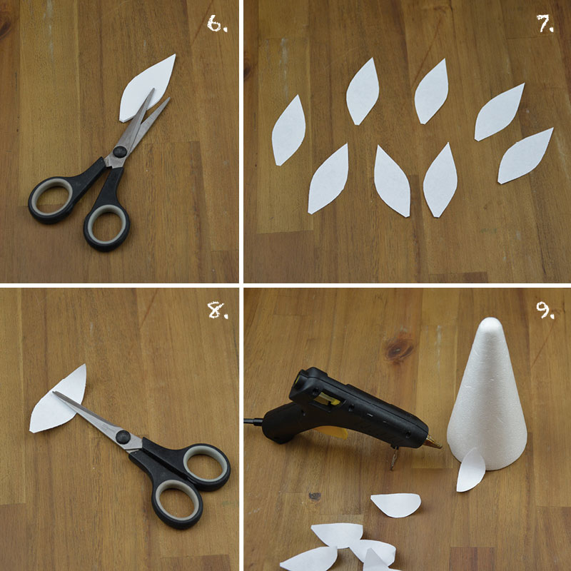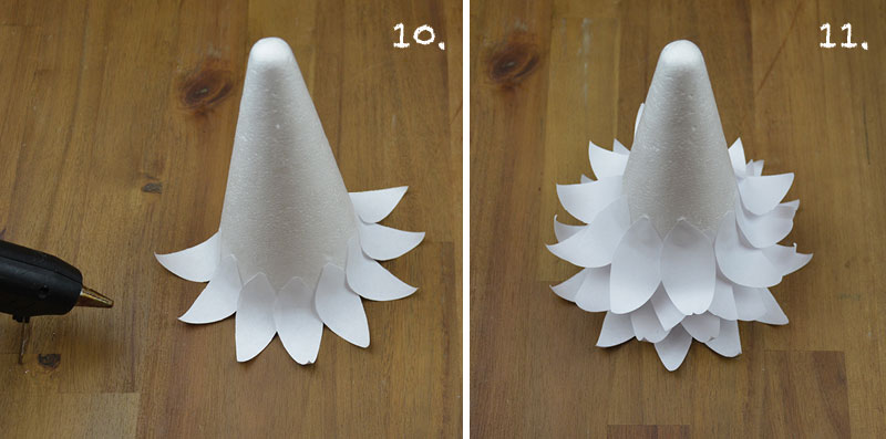 - Mit einer Heißklebepistole die einzelnen Blätter ringsherum um einen Styroporkegel kleben. Die Blätter sollten ein paar Millimeter überlappen.