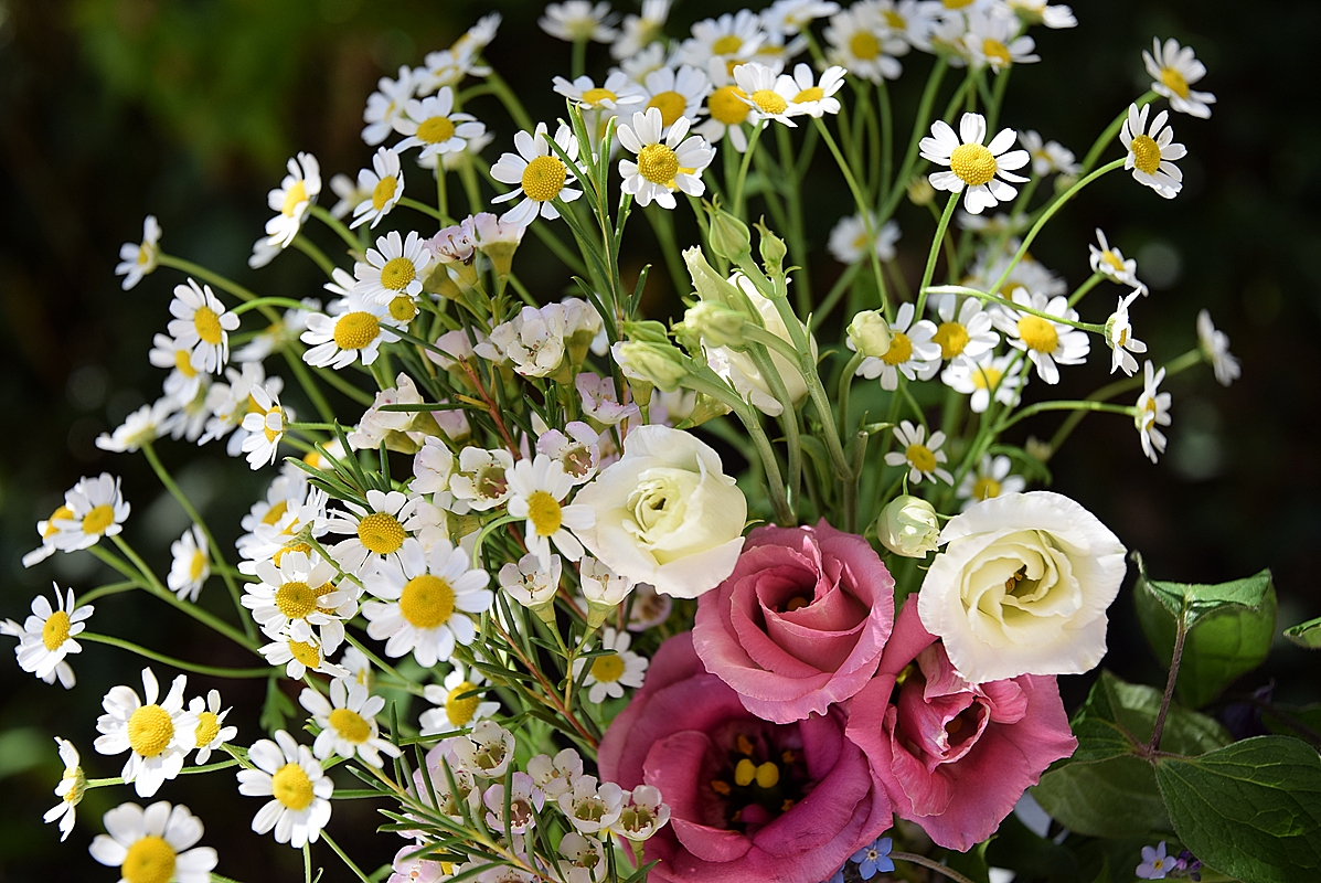 Wohlriechende Kamillenblüten und filigrane Wachsblumen treffen auf den farbenprächtigen Lisianthus. Lisianthus oder auch Eustoma genannt gibt es in vielen verschiedenen Farben und wird aufgrund seiner wunderschönen Blüten und seiner langen Haltbarkeit gerne für Brautsträuße oder Tischgestecke verwendet.