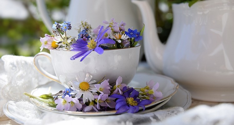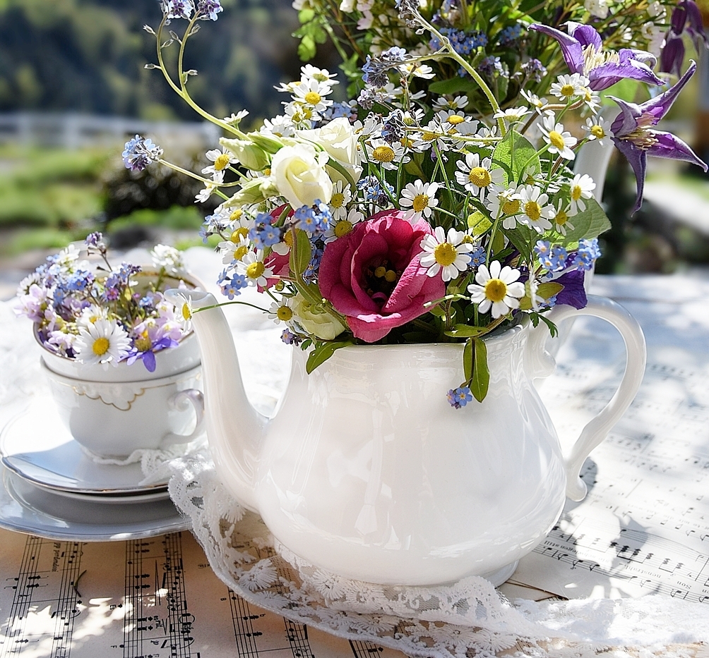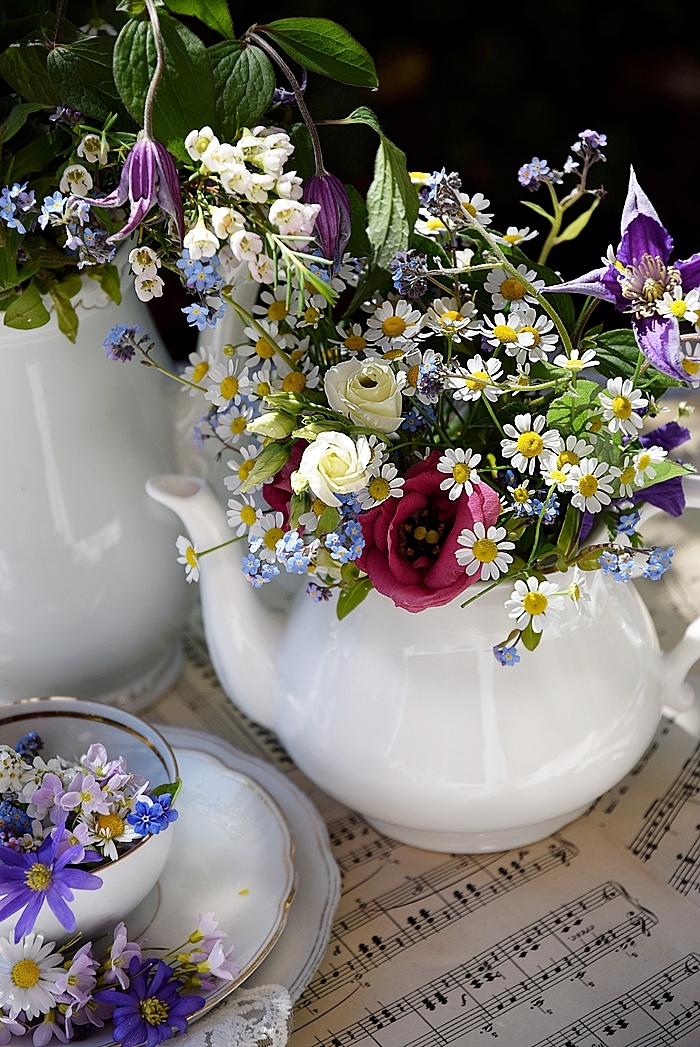 Eigentlich verwende ich sehr selten herkömmliche Vasen für meine Blumensträuße. Ich liebe es, Blumen in Flaschen, alten Gefäßen oder edlem Porzellan zu dekorieren. Aus romantischen Blumensträußen und weißem, edlem Porzellan lassen sich zauberhafte, nostalgisch-romantische Blumenarrangements errichten. Kombiniert mit typischen Vintage-Dekoelementen, wie alten Büchern, Noten oder Spitzen, lassen sich wunderschöne Vintage-Dekorationen mit einem ganz besonderen Charme zaubern.