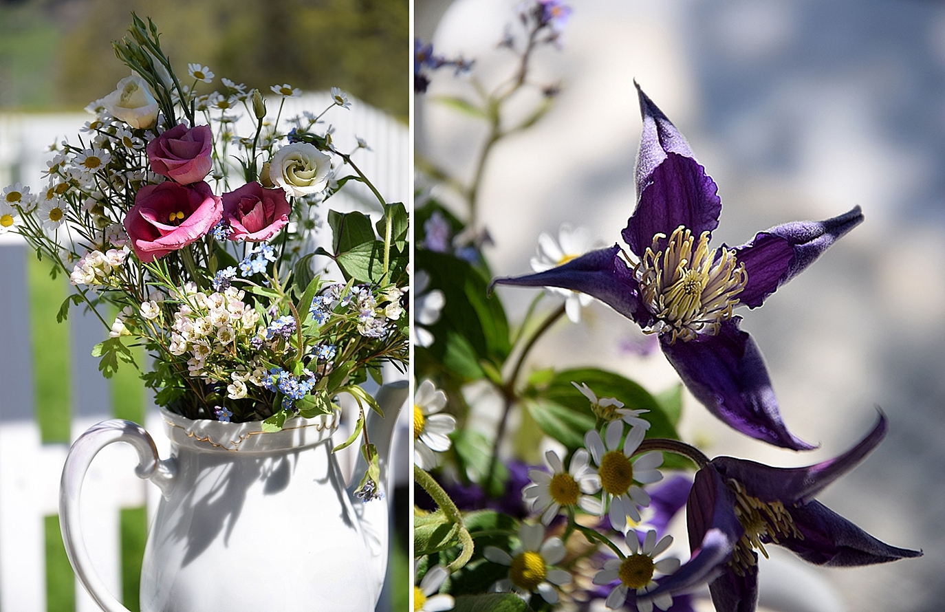 Für meine Blumenarrangements verwende ich am liebsten Wiesenblumen von der Pferdeweide nebenan. Doch leider blühen dieses Jahr aufgrund des kalten Frühjahrs noch nicht all zu viele Blumen auf der Wiese und so habe ich einfach ein paar Blumen aus der Gärtnerei mit Wildblumen wie, Vergissmeinnicht, Gänseblümchen und Wiesenschaumkraut kombiniert.