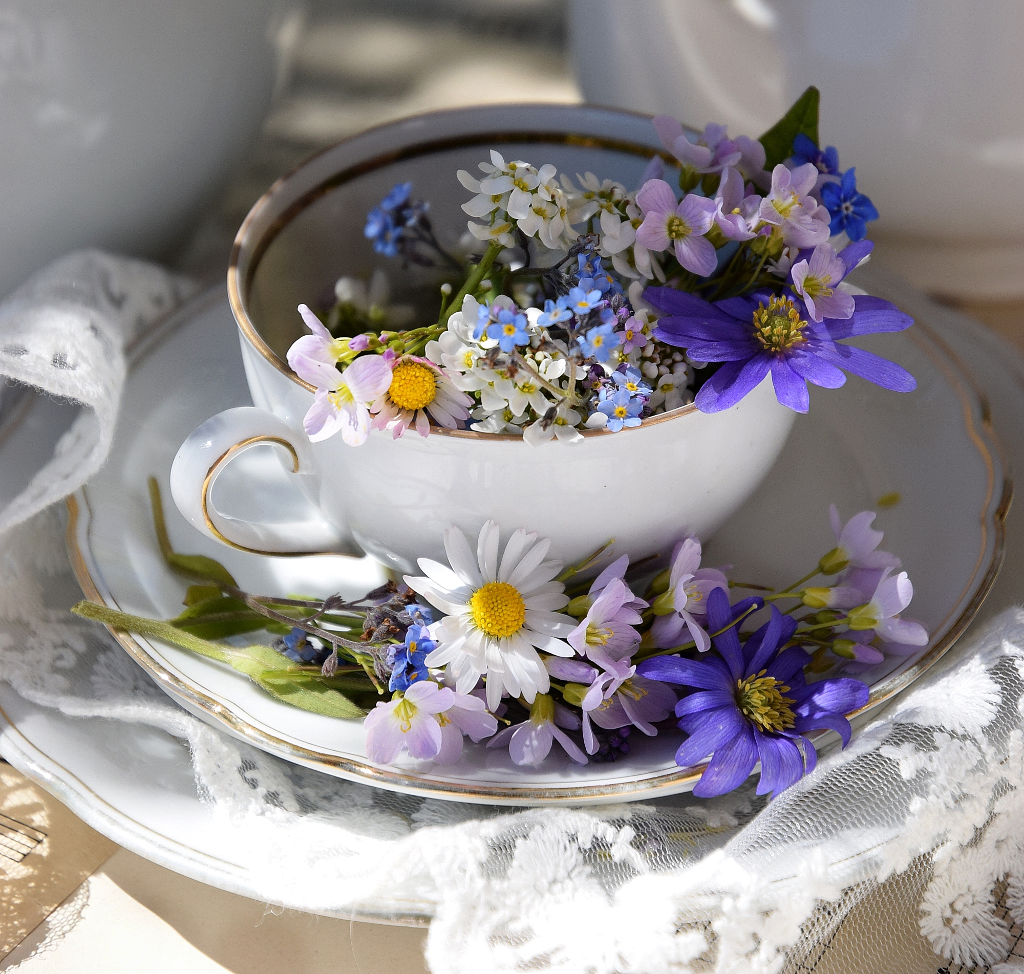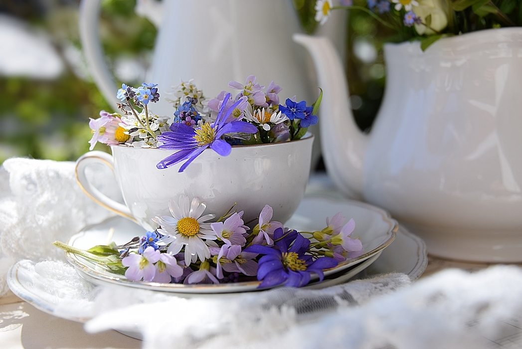 Spitze, schönes Geschirr und Wildblumen sind eine ganz fantastische Kombination. Eine wunderbare Idee und ganz tolle Bilder.