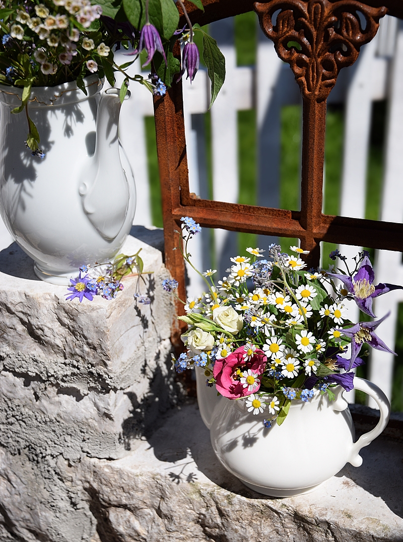 Ob auf der Mauer im Garten oder dem Tisch auf der Terrasse, solch ein nostalgisches Blumenarrangement bietet überall einen herrlichen Anblick und erfreut Auge und Herz jedes Betrachters. Auch als ein ganz besonderes Geschenk oder Mitbringsel eignet sich so ein nostalgisches Blumenarrangement hervorragend. Ich bin mir sicher, ihr zaubert damit euren Liebsten ein Lächeln ins Gesicht, denn wie schon Ralph Waldo Emerson zitierte: „Blumen sind das Lächeln der Erde“.
