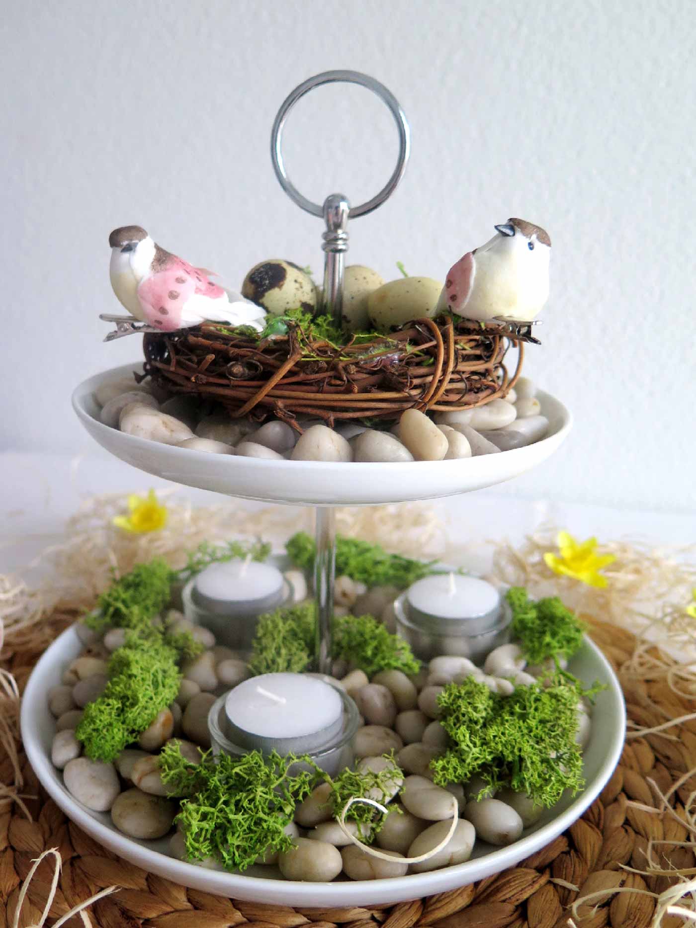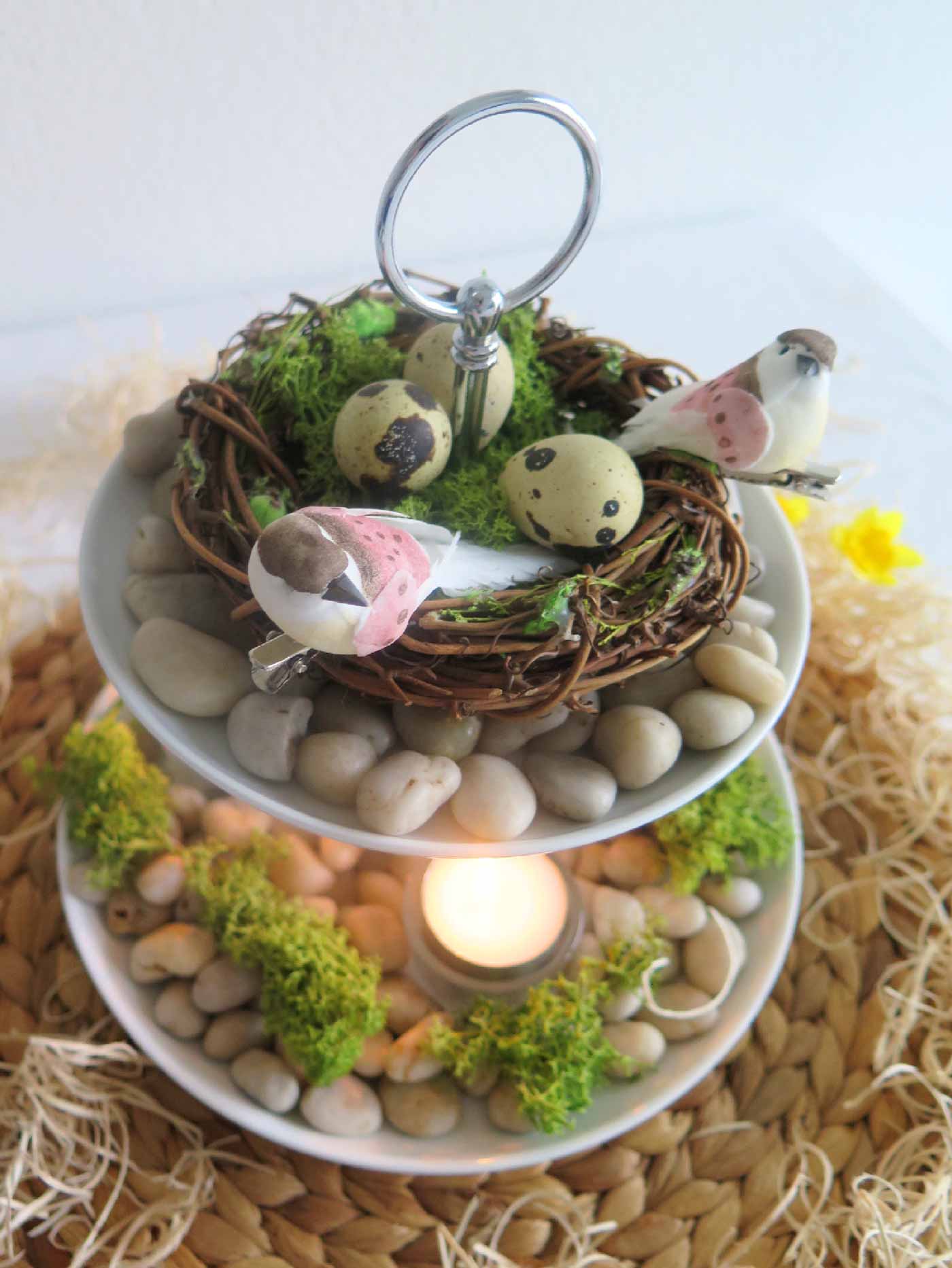 Das Kernstück meiner Kreation bildet eine weisse, zweistöckige Étagere. Diese habe ich mit Dekosteinen in Naturfarben verschönert. Anschliessend habe ich auf der oberen Etage das kleine Weidenkränzchen mit den rosafarbenen Dekovögel, dem saftig grünen Islandmoos und den Wachteleiern dekoriert. Zu guter Letzt habe ich die untere Etage nach Belieben mit Moos ausgekleidet und weisse Rechaudkerzen darauf arrangiert– und schon ist es vollbracht!