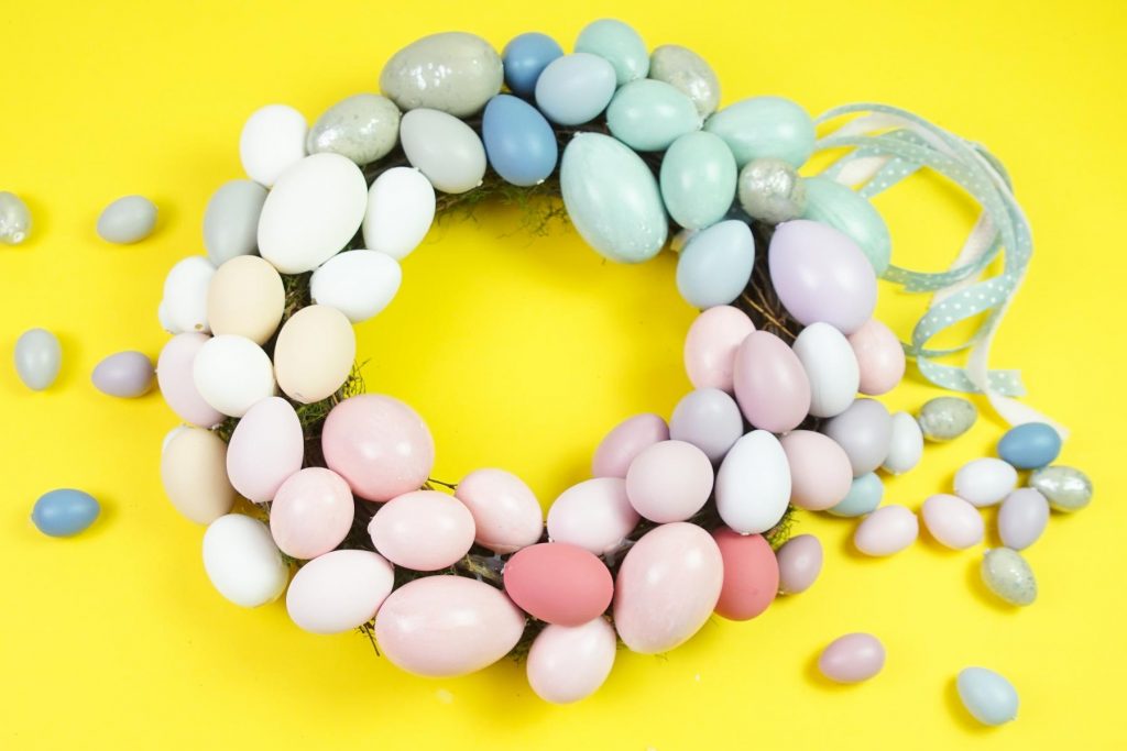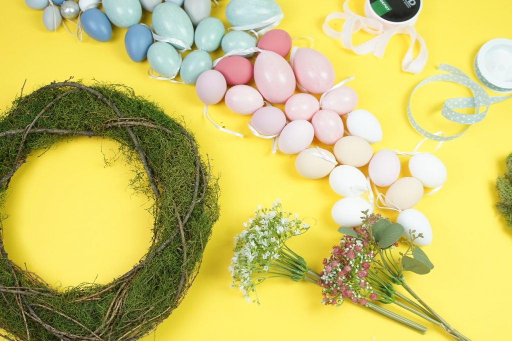 5. Bevor du die letzten „großen Eier“ an den Rohling klebst, denke daran, noch Bänder (ca. 1,5 m lang) um den Kranz zu binden. Damit stellt dich das Aufhängen später nicht vor eine Herausforderung.