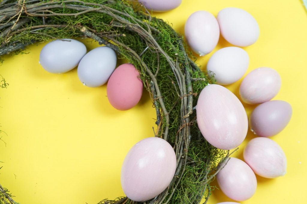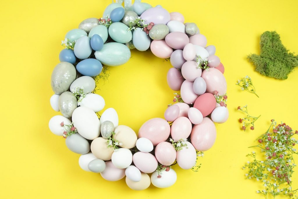 6. Klebe nun die restlichen Eier an den Kranz. Betrachte den Eierkranz nun aus einiger Entfernung. Ist irgendwo eine Lücke? Dann kannst du nun anfangen mit den kleinen Eiern diese Lücken zu schließen.