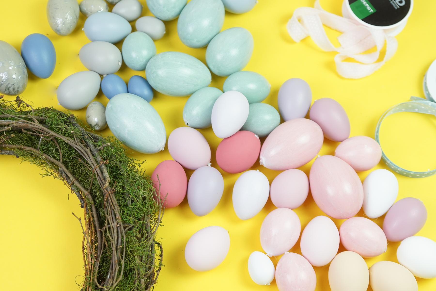 2. Da ich einen Farbverlauf (Ombre) auf dem Kranz haben möchte, habe ich, damit es sich einfacher gestaltet, die Eier vorab so hingelegt wie sie später an den Kranz kommen.