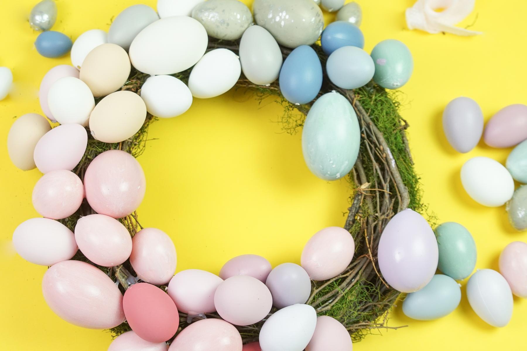 6. Klebe nun die restlichen Eier an den Kranz. Betrachte den Eierkranz nun aus einiger Entfernung. Ist irgendwo eine Lücke? Dann kannst du nun anfangen mit den kleinen Eiern diese Lücken zu schließen.