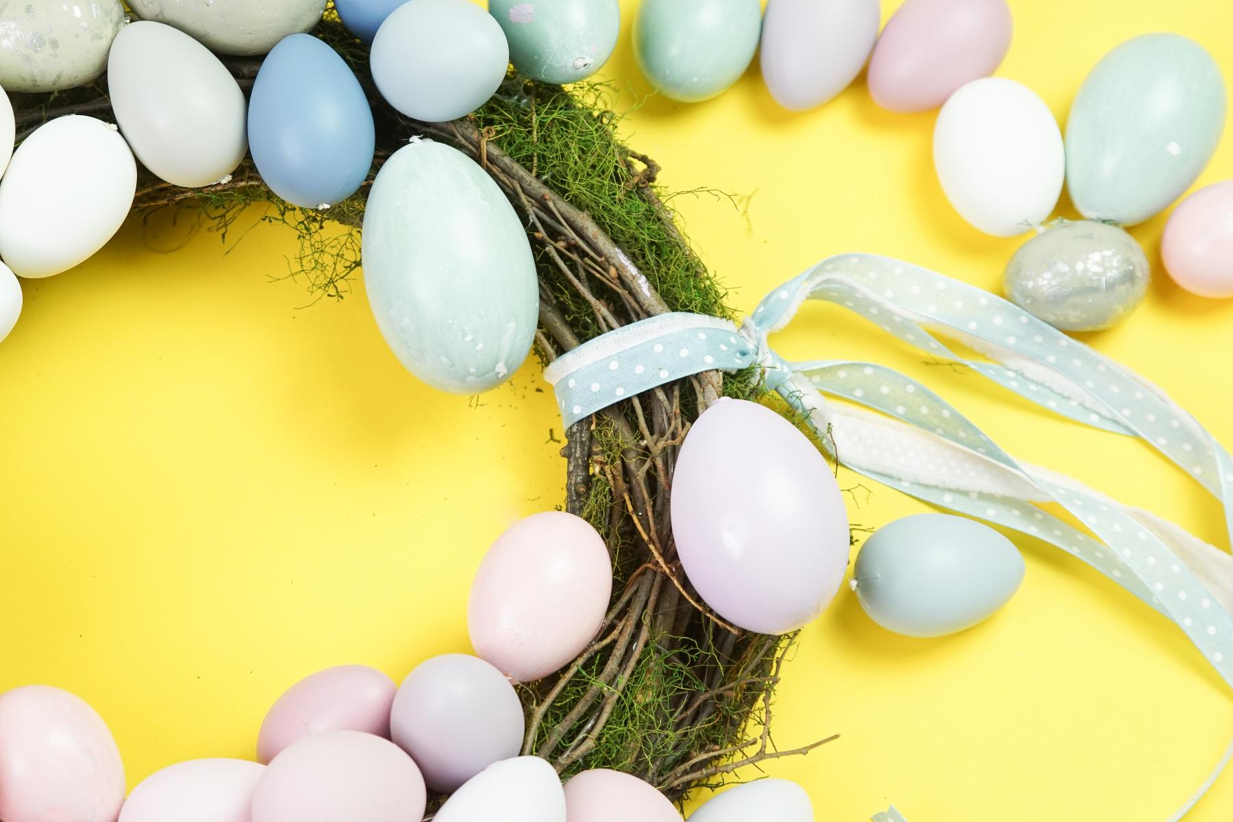 5. Bevor du die letzten „großen Eier“ an den Rohling klebst, denke daran, noch Bänder (ca. 1,5 m lang) um den Kranz zu binden. Damit stellt dich das Aufhängen später nicht vor eine Herausforderung.