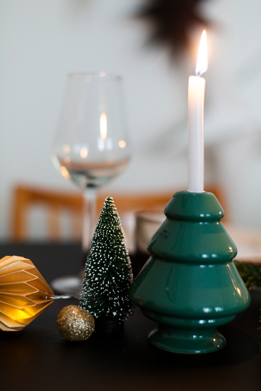 An der hinteren Wand habe ich ein paar Weihnachtssterne aus festem Papier angebracht, die ich bei DEPOT gefunden hab. Diese Variante lässt sich easy zusammenfalten und daher auch für’s kommende Jahr gut verstauen. In der Mitte des Tisches arrangiere ich eine Lichterkette, dazwischen stelle ich ein paar Kerzenleuchter, die kleinen Dekobäumchen von DEPOT sowie ein paar Tannenzapfen in einer Reihe und verteile sie der Länge nach über dem Tisch.