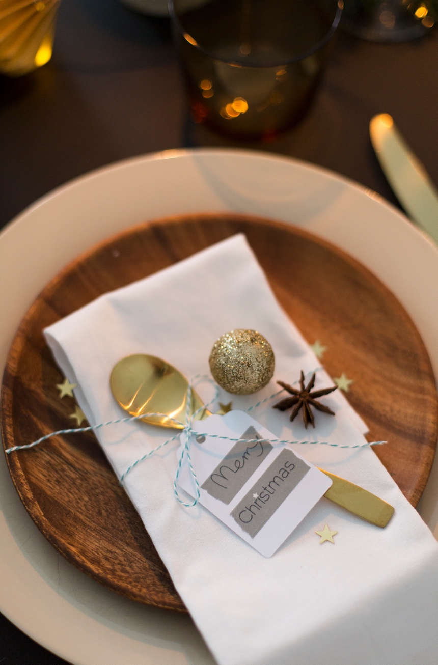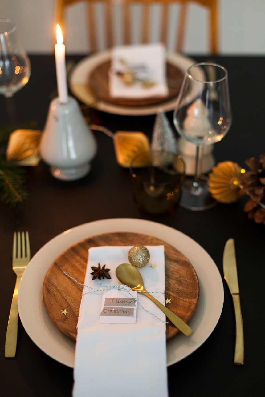 Für das Festliche sorgt definitiv das edle Besteck, man isst ja nicht jeden Tag mit goldenem Besteck! Dazu passend stelle ich ockerfarbige Wassergläser sowie Weingläser rechts daneben. Für die jeweiligen Sitzplätze habe ich mit einem Stanzer weiße Etiketten ausgestanzt, ein Loch mit einer Ösenzange gemacht, um die Serviette den Bäckersgarn in Türkis mit dem Etikett gebunden. Auf das Etikett klebte ich ein schlampig abgerissenes Masking Tape mit dem “ Merry Christmas“ Schriftzug – ist mal was anderes als eine handgeschriebene Variante. Auf den Vorspeisenteller dekorierte ich je eine Glitzerkugel sowie ein paar goldene Sreusterne, die ich beide bei DEPOT gefunden hab, dazu ein kleiner Sternanis und fertig ist die festliche Tischdekoration.