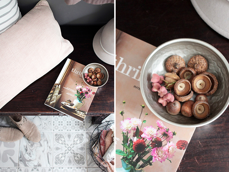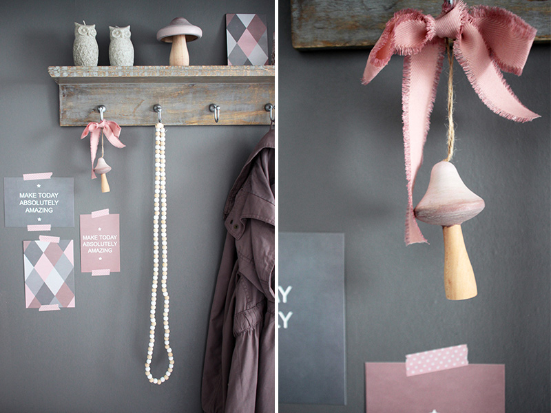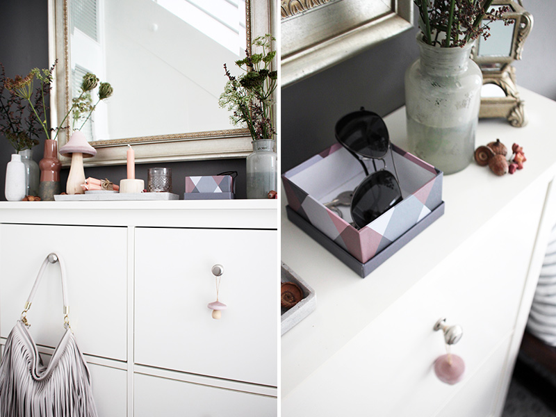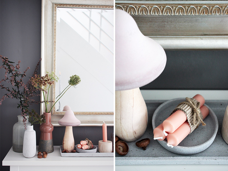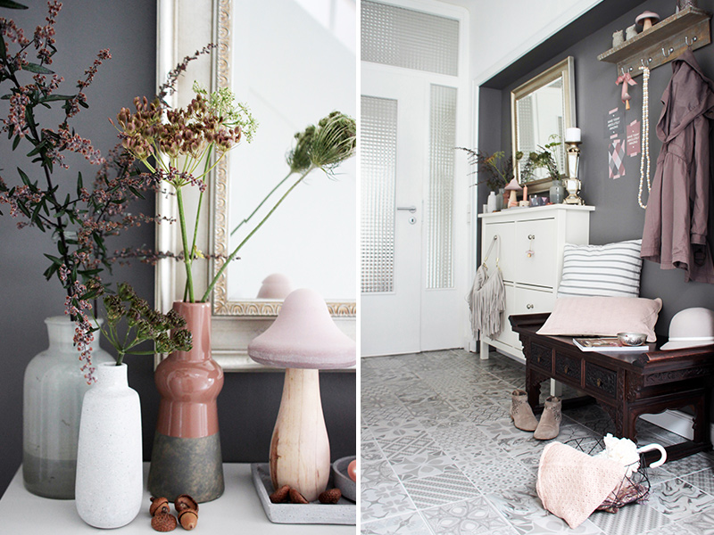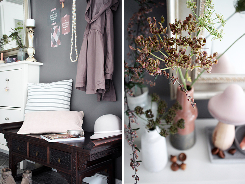 Kleine Details in Rosatönen harmonieren perfekt mit den vorherrschenden Farben Grau und Weiß. Noch ein paar Blumen und Gräser vom letzten Spaziergang in verschieden Vasen schön arrangiert, fertig ist die Herbstdeko für den Eingangsbereich.
