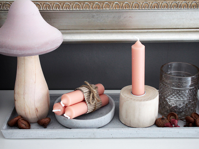 - Dekomaterialien aus Naturmaterialien, wie Holz, z.B. in Form von Kerzenständern oder Dekokugeln – Tipp: trendy ist im Moment helles, unbehandeltes Holz