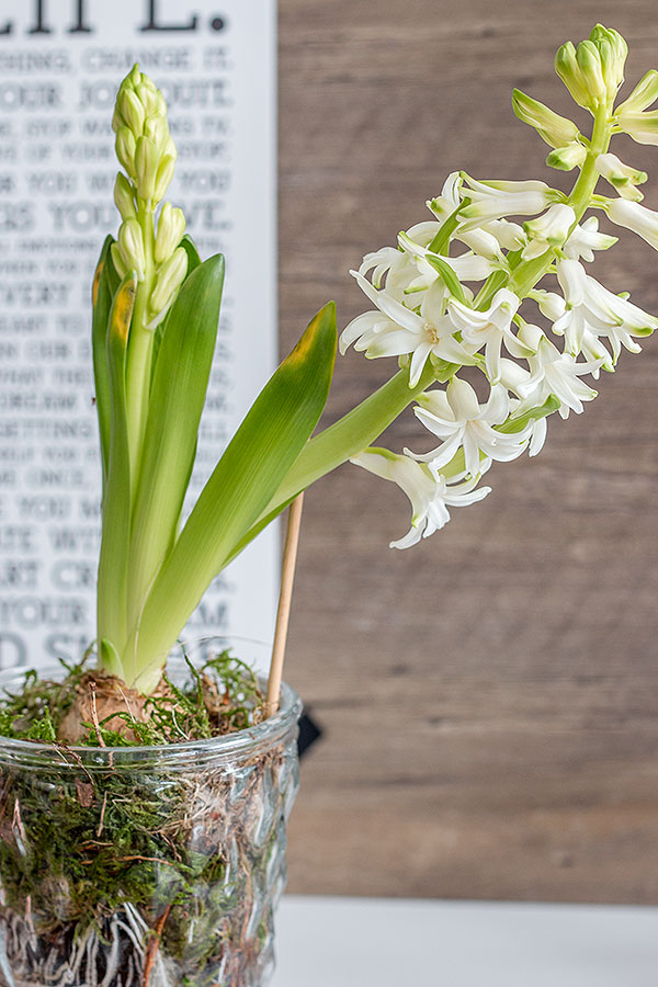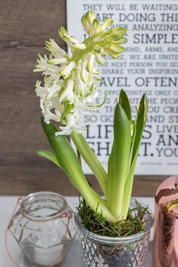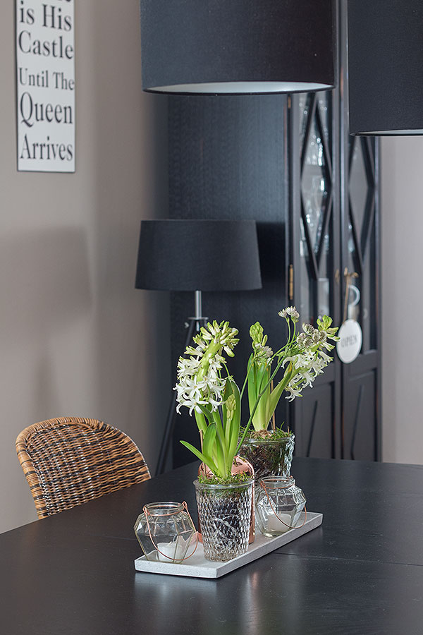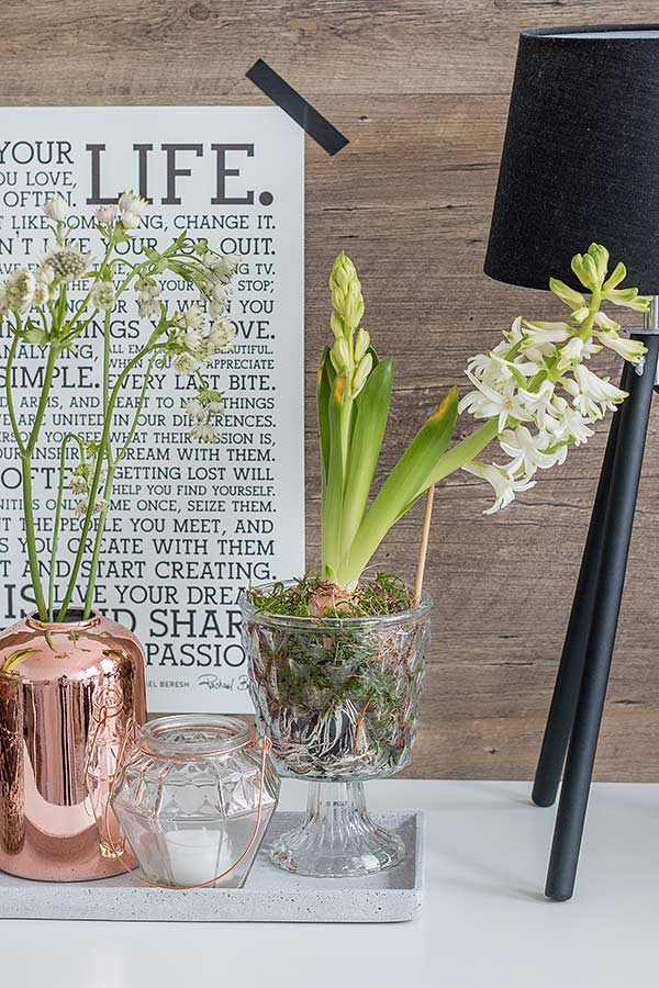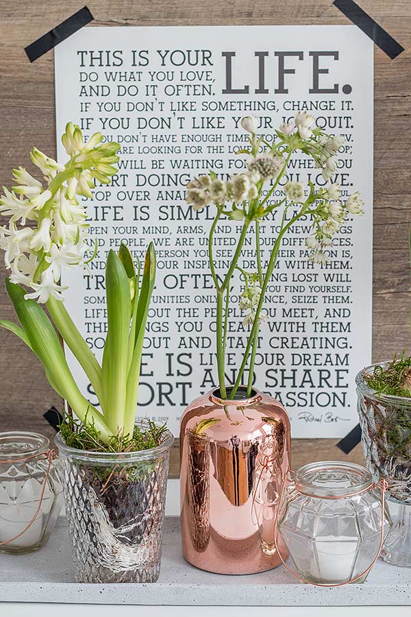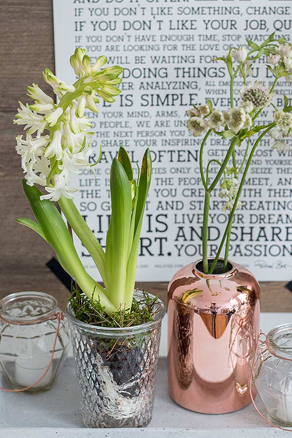 Die Hyazinthen aus dem Topf zusammen mit der Erde lösen und in die Windlichter setzen. Oben mit etwas Moos bedecken. Vorsichtig mit Wasser gießen. Nur die Wurzeln unten sollten etwas im Wasser stehen. Alle 2 Tage etwas Wasser nachgießen. Die Vase könnt ihr mit Schnittblumen in einer ähnlichen Farbe bestücken, z.B. weiße Tulpen oder die Blümchen auf meinem Bild, von denen ich leider den Namen vergessen habe. Vielleicht wisst ihr ihn ja? Mir will er partout nicht einfallen, obwohl ich den Blumenhändler extra danach gefragt habe. Nun die Vasen, Windlichter und Teelichthalter so auf dem Dekotablett arrangieren, dass sich unterschiedliche Höhenunterschiede ergeben. Das lockert das Ganze auf und bringt Spannung in die Frühlingsdeko. Wenn noch etwas Platz auf eurem Tablett ist, könnt ihr auch hier und da noch ein Jumboteelicht dazwischen platzieren. Und fertig ist die easy peasy Frühlingsdeko im Kupfer- und Betonlook!
