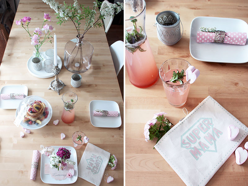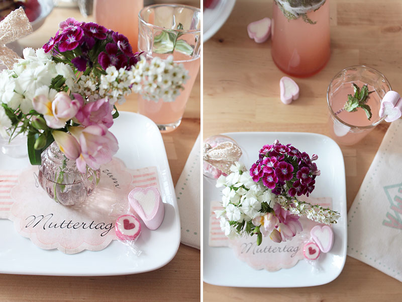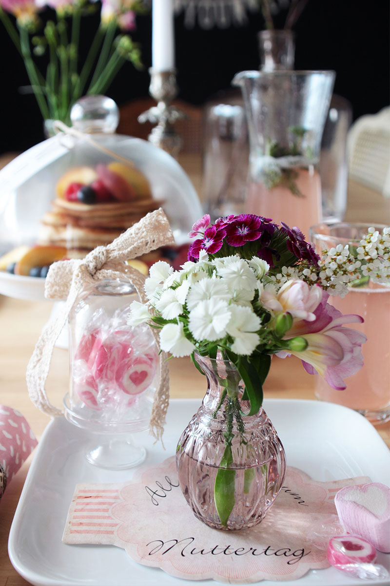 Doch an diesem besonderen Tag freut sich jede Mama über eine kleine Aufmerksamkeit, z. B. einem leckeren Muttertagsfrühstück mit frischem Kaffee, selbstgemachten Pancakes mit Früchten und Rababer-Erdbeer-Limonade. Die passende Tischdeko darf dabei natürlich nicht fehlen – frische Blumen, Kerzen und ein paar kleine Aufmerksamkeiten für die Mama. Die Grundlage bildet ein einfaches, weißes Geschirr. Den Teller des Ehrengasts ziert ein ausgedruckter Muttertagsgruß (den Free Printable findet ihr am Ende des Beitrags) und eine Minivase mit Blumenbouquet.