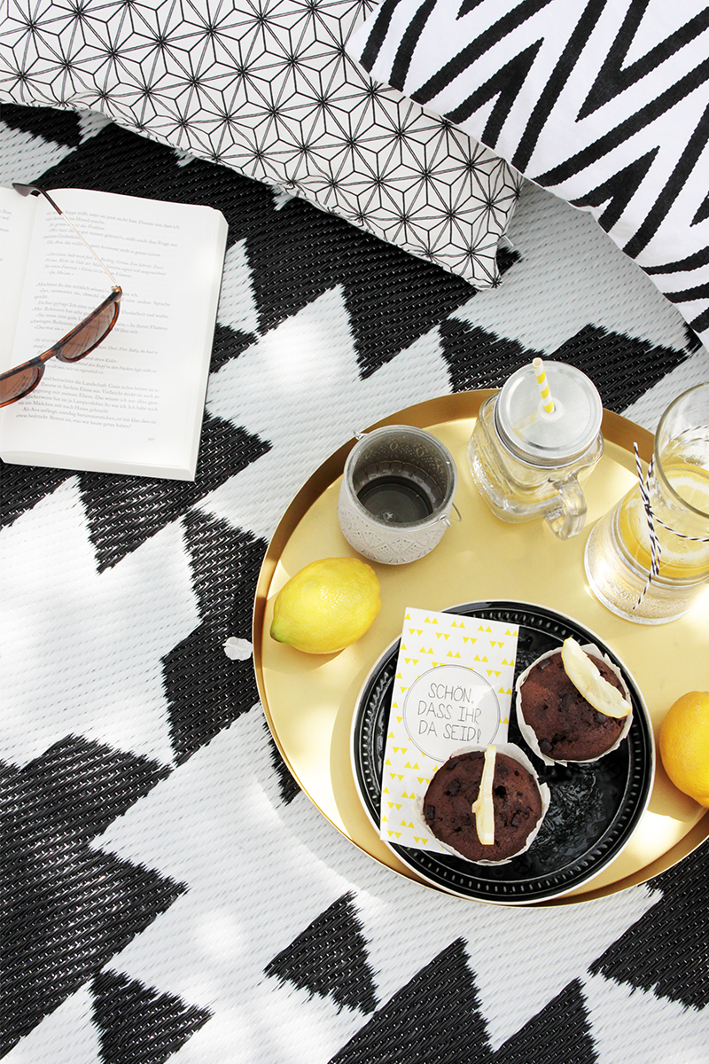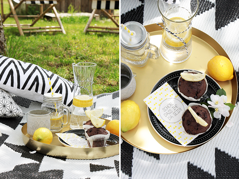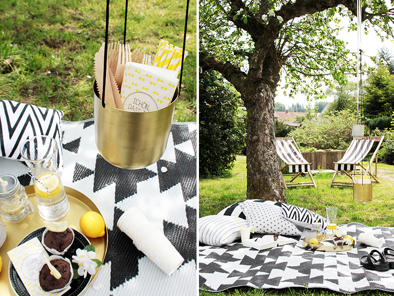 Wer will veranstaltet einfach ein schnelles Mini-Picknick auf dem Boden – ein paar Muffins, Wasser mit frischen Zitronenscheiben und einem gemütlichen Mittag in der Sonne steht nichts mehr im Wege. Als Praktischer Helfer für Besteck, Servietten und Strohhalme dient eine Blumenampel, die ich an einem Ast befestigt habe. So hat man alles griffbereit und muss dazu noch nicht einmal aufstehen.