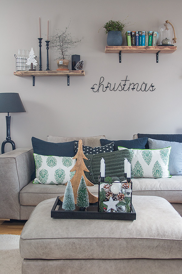 Außerdem durften noch naturfarbene und grüne Tannenbäume bei uns einziehen. Sie passen perfekt zum Inhalt des Glaskastens und geben dem Ganzen noch zusätzlich einen weihnachtlichen Touch. Und seht Ihr den Schriftzug „Christmas“ an der Wand? Da ich sowieso ein großer Fan von Schriftzügen bin, landete dieser auch noch mit im Einkaufskorb. Ich rate Euch allerdings diesen richtig mit Nägeln zu befestigen oder an die Wand zu lehnen. Meine Maskingtapes hielten genau 1 Stunde, danach machte es „ratsch“ und der Schriftzug fiel nach unten. Seit Jahren wächst meine Advents- und Weihnachtsdeko stetig. Jedes Jahr kommen neue Kugeln und weihnachtliche Dekoelemente dazu. Meistens in den Farben weiß, natur und rot. Ich mag diese Farbkombination sehr gerne. Sie lässt sich prima jedes Jahr aufs Neue kombinieren und macht sich auch toll an einem Weihnachtsbaum oder Adventsgesteck.