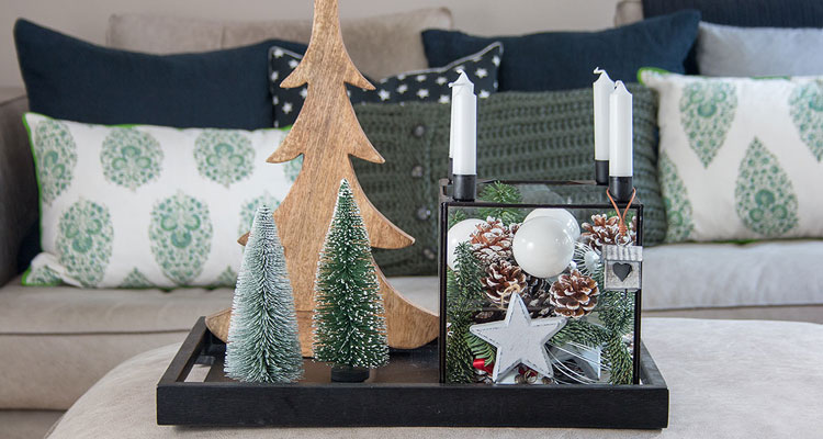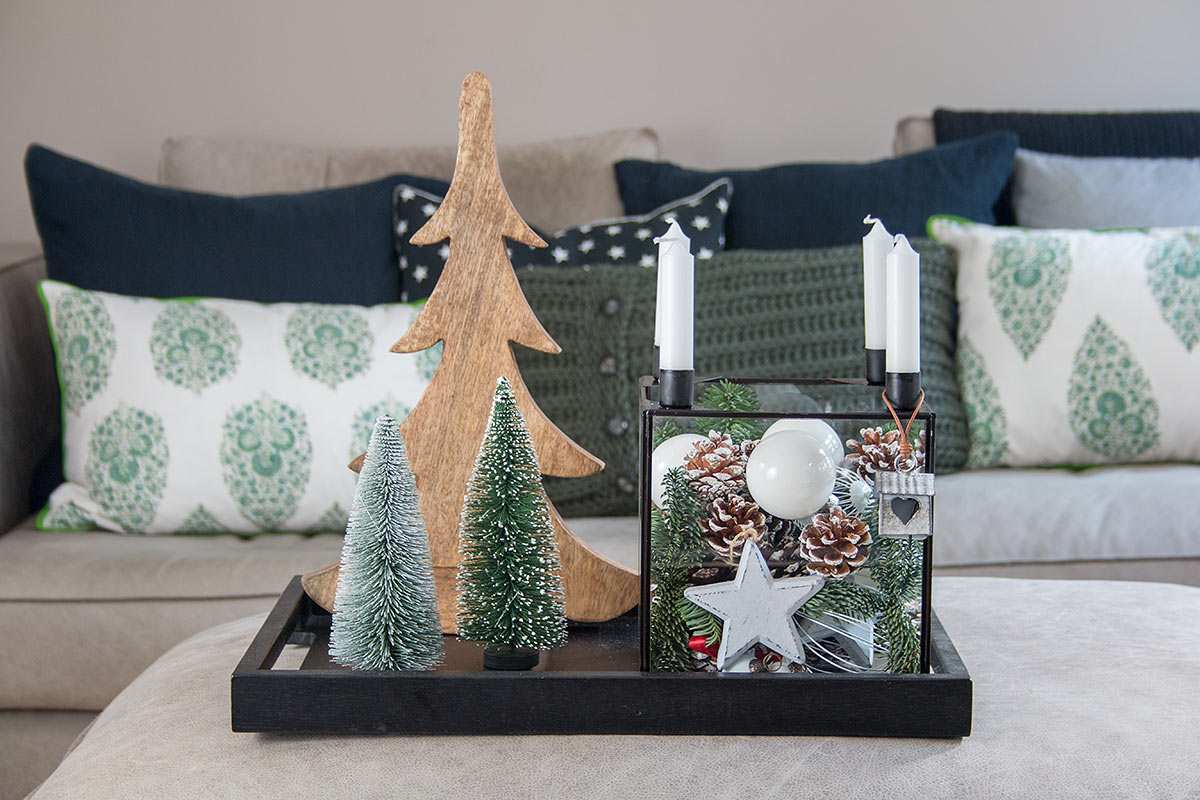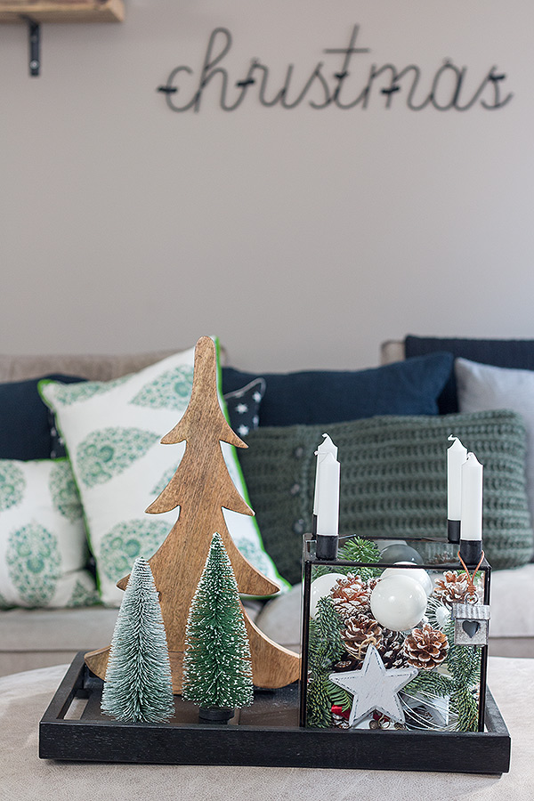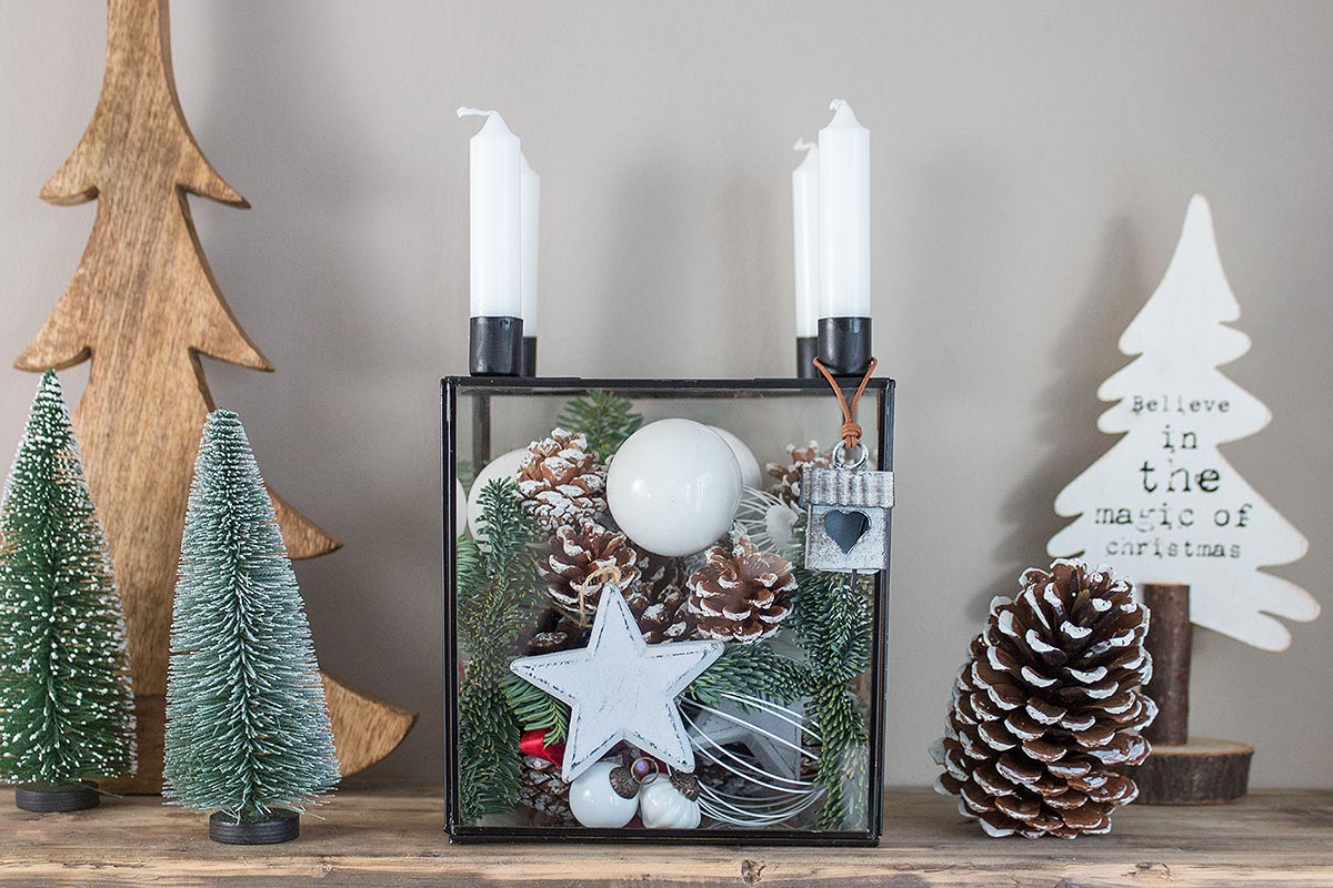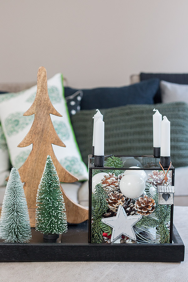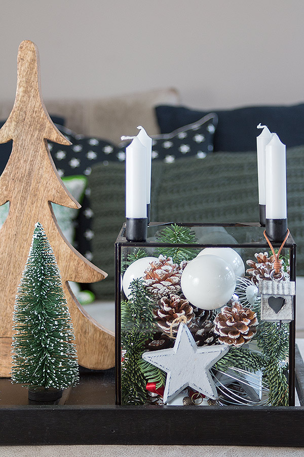 Ich habe zuerst größere Zapfen in den Glaskasten gegeben, dann das Tannengrün dazwischen gesteckt und mit kleineren Zapfen, Kugeln und Sternen aufgefüllt. Um die Kerzenhalter lassen sich auch gut weihnachtliche Dekoelemente hängen. Hier sind Eurer Fantasie keine Grenzen gesetzt. Zum Schluss die Kerzen nicht vergessen. Ich habe mich für 4 kleine Stabkerzen entschieden, aber auch lange Spitzkerzen passen hervorragend. Den Glaskasten könnt Ihr alleine als Tischdeko verwenden oder z.B. wie ich mit anderen weihnachtlichen Elementen kombinieren. Mit Deko-Weihnachtsbäumen aus unterschiedlichen Materialien und in unterschiedlichen Größen schafft Ihr ein tolles Gesamtbild, dass sich sehr gut auf einem Tablett oder auch auf einer Kommode arrangieren lässt. Ein kleines Winterwonderland, perfekt für die bevorstehende Adventszeit!