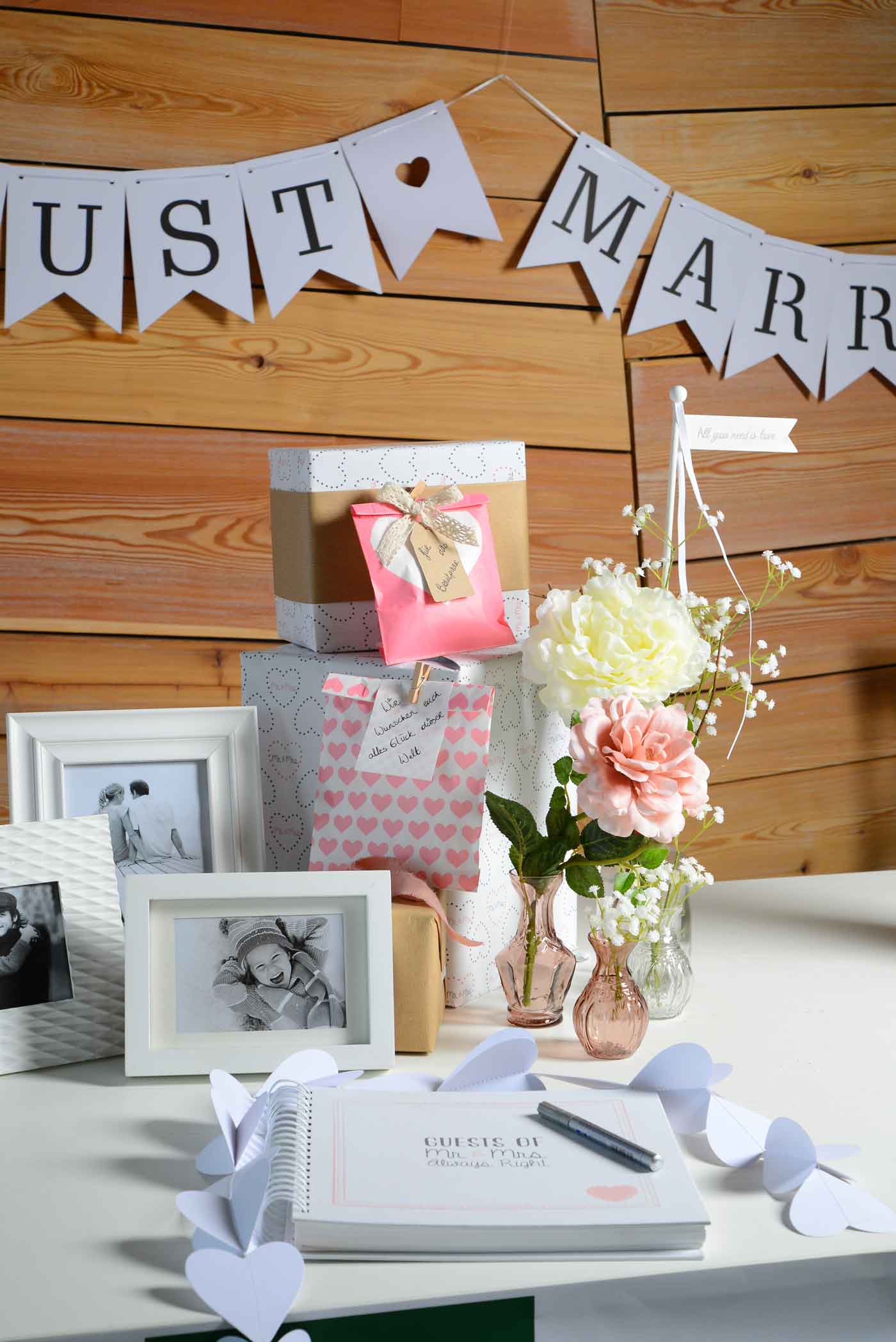 Auch das Gästebuch für die Glückwünsche an das Brautpaar findet hier seinen Platz. In unserem Sortiment finden auch Eure Gäste alles rund um das Thema Verpacken: Geschenkpapier, Bänder