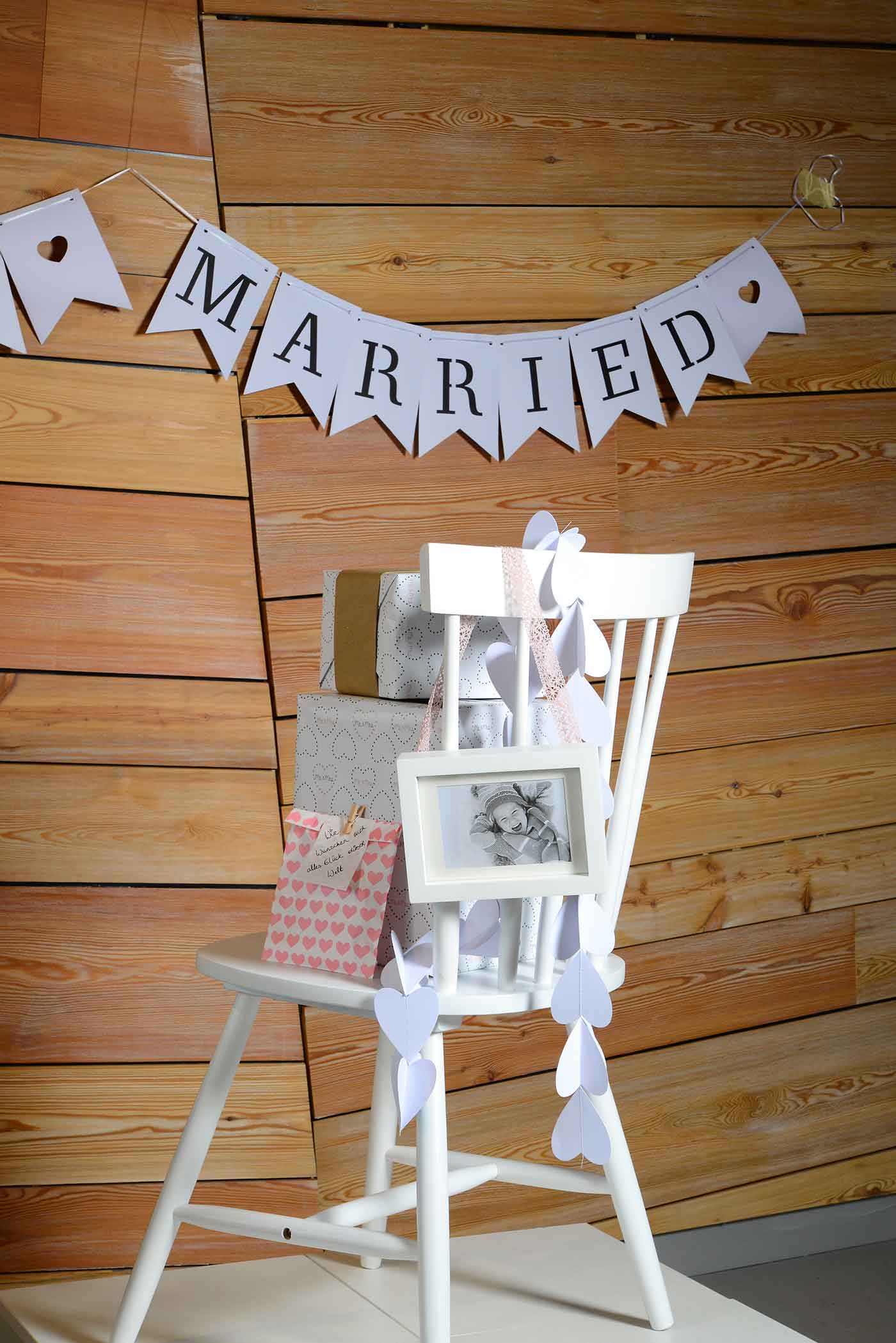 Gebt Euren Gästen einen liebevoll gestalteten Platz. Einfach ein Foto Eurer Liebsten in einem schönen Bilderrahmen platzieren, Schleifenband an der Bilderrahmenrückseite mit etwas Heißkleber befestigen und über die Stuhllehne hängen. Süße Kleinigkeiten wie eine Herzgirlande geben dem Ehrenplatz den letzten Schliff.