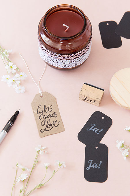 - Dann ein Etikett mit dem Spruch „Light your Love“ beschriften (entweder per Hand, mit Stempeln oder ausgedruckt).