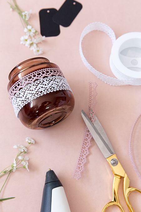- Das Spitzenband mit dem Heißkleber um die Kerze herumkleben.