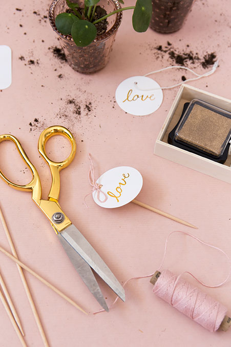 - Das LOVE-Etikett mit einem Garn oder Dekoband an dem Holzspieß befestigen. Den Holzspieß vorher ggf. mit der Schere etwas kürzen.